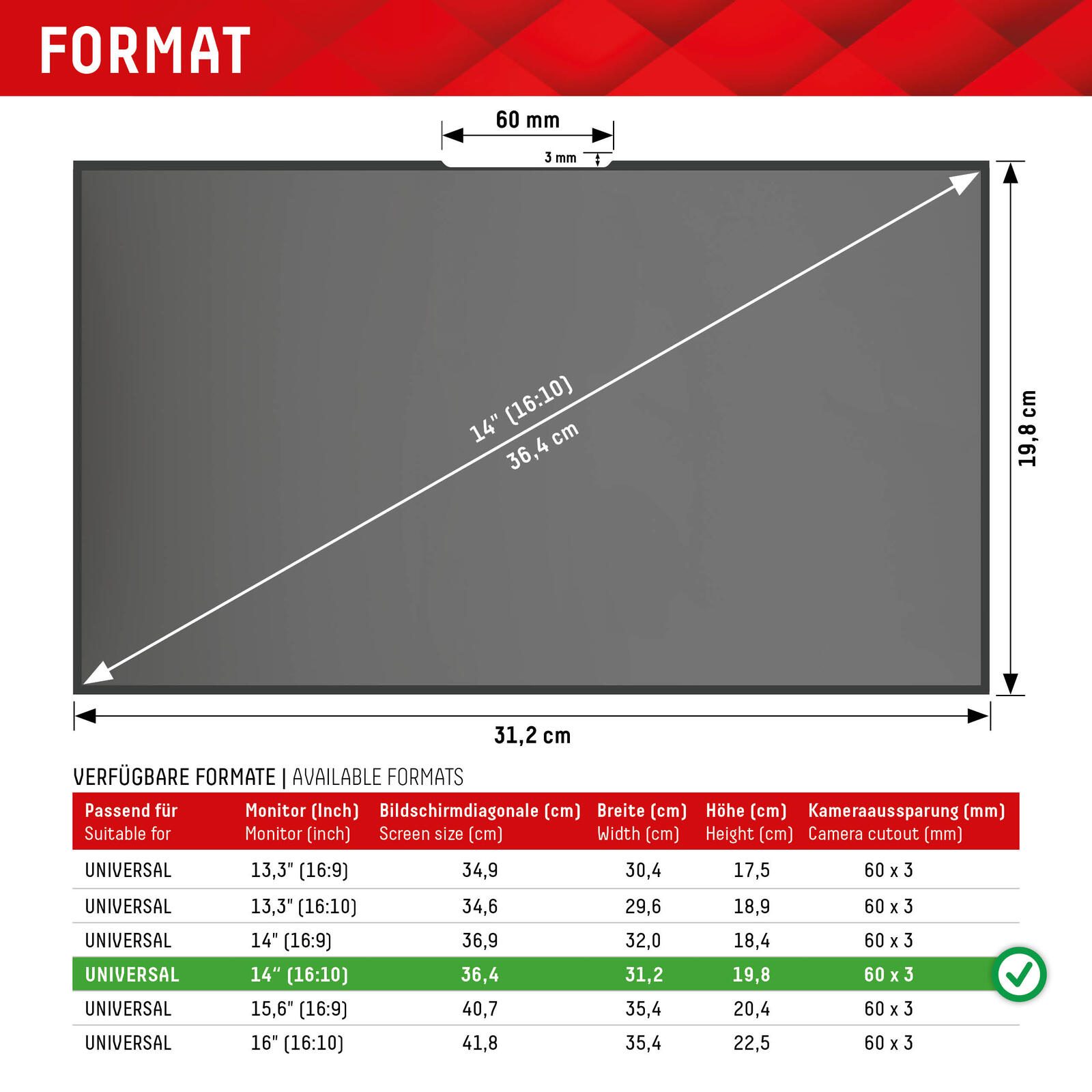 DISPLEX PRIVACY SAFE Wiederablösbarer 2-Wege Blickschutzfilter für Laptop/ Notebook (randlos/frameless) 14'' (16:10) Befestigung ohne Klebstoff, abnehmbar, glänzende Blickschutzfolie