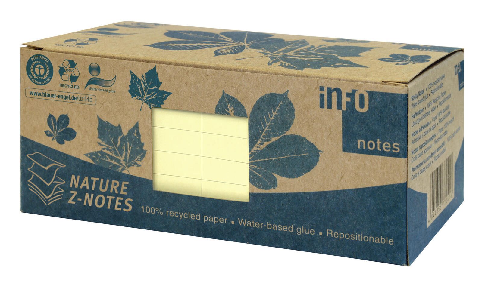 Die inFO Recycling Haftnotizen in der praktischen Größe von 7,5 x 7,5 cm sind die perfekte Lösung für alle, die ihre Gedanken und Ideen schnell festhalten möchten. Diese umweltfreundlichen Haftnotizen bestehen aus hochwertigem Recycling-Papier, was sie nicht nur nachhaltig, sondern auch besonders benutzerfreundlich macht. Die auffällige gelbe Farbe sorgt dafür, dass deine Notizen immer ins Auge fallen und du wichtige Informationen nicht übersiehst. Die Z-Faltung der Blöcke ermöglicht eine einfache Handhabung und sorgt dafür, dass du die Haftnotizen mühelos abziehen kannst, ohne dass sie beschädigt werden. Mit 100 Blatt pro Block hast du genügend Platz, um all deine Notizen, Erinnerungen oder To-Do-Listen festzuhalten. Die Standard-Haftung garantiert, dass die Notizen sicher an ihren vorgesehenen Stellen haften, egal ob an deinem Computer, im Notizbuch oder an der Wand. Ein Pack enthält insgesamt 12 Blöcke, sodass du immer einen Vorrat an Haftnotizen zur Hand hast. Ideal für das Büro, die Schule oder für den privaten Gebrauch, bieten die inFO Recycling Haftnotizen eine praktische und umweltbewusste Lösung für deine Notizbedürfnisse. Mit diesen Haftnotizen trägst du nicht nur zur Organisation deines Alltags bei, sondern unterstützt auch aktiv den Umweltschutz durch die Verwendung von Recycling-Materialien. Die inFO Recycling Haftnotizen sind somit nicht nur funktional, sondern auch eine umweltfreundliche Wahl für alle, die Wert auf Nachhaltigkeit legen.Technische Daten