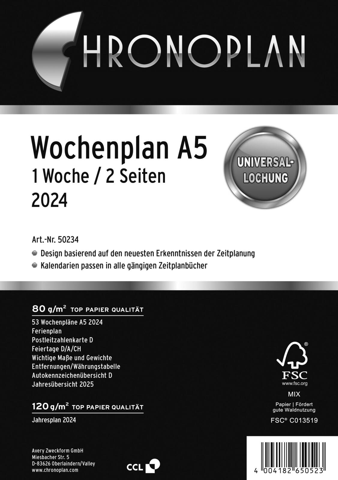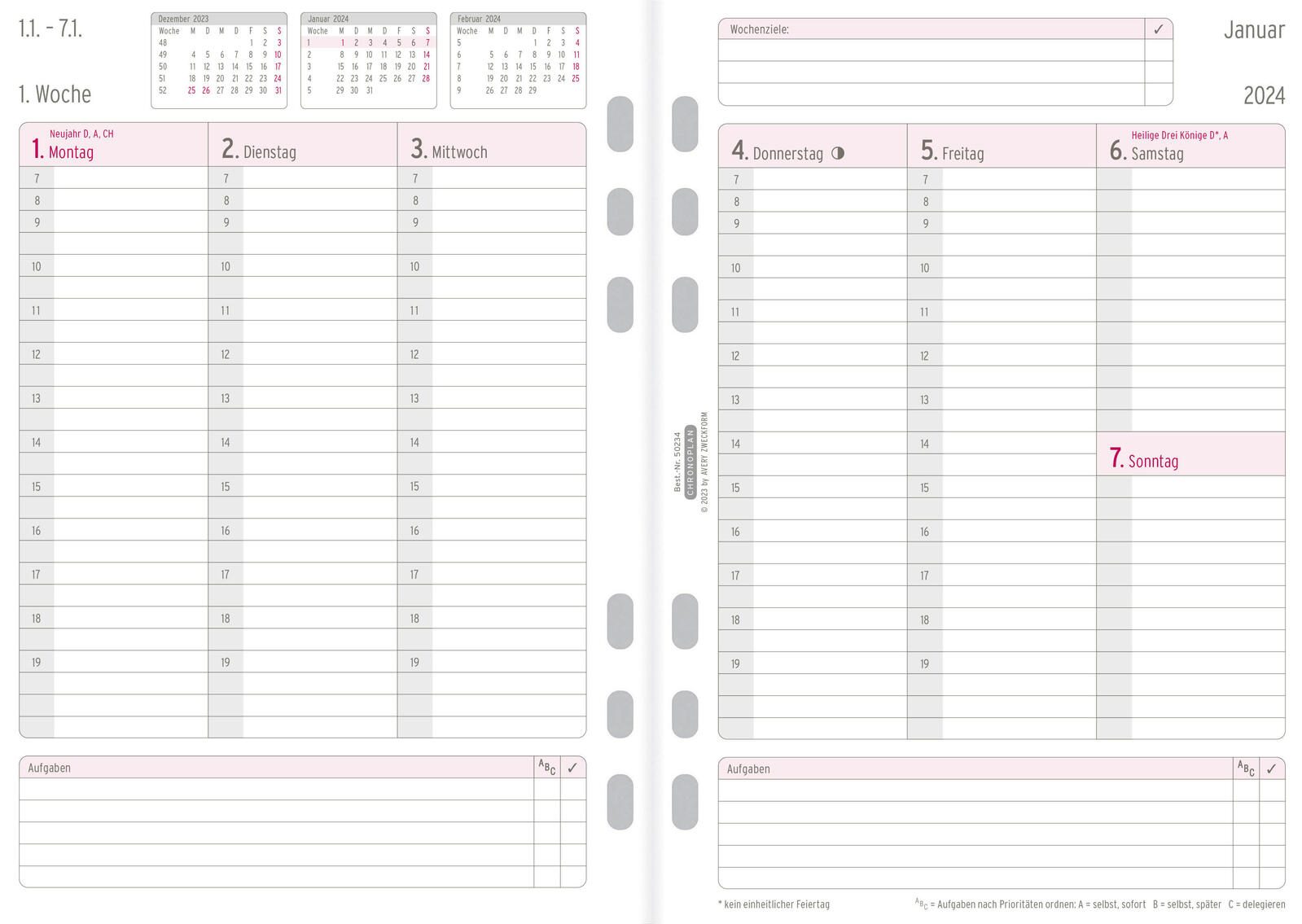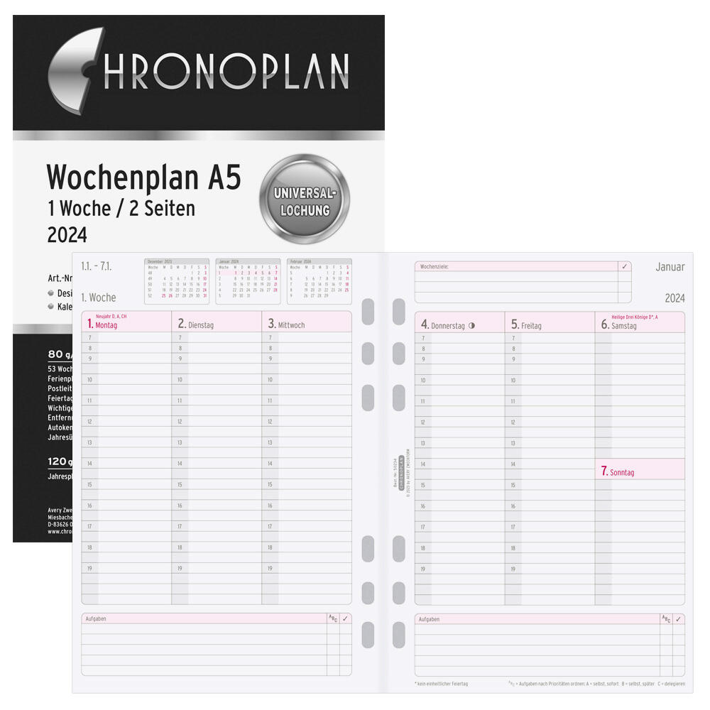 Die CHRONOPLAN Kalendereinlage 2024 im Format A5 bietet Ihnen eine durchdachte Organisation Ihrer Woche auf zwei Seiten. Mit der praktischen Universal-Lochung ist diese Kalendereinlage vielseitig einsetzbar und lässt sich problemlos in die meisten Ringbuchsysteme integrieren. Das DIN A5 Format ist ideal für den täglichen Gebrauch, da es genügend Platz für Notizen, Termine und To-Do-Listen bietet, ohne dabei zu viel Platz in Ihrer Tasche einzunehmen.