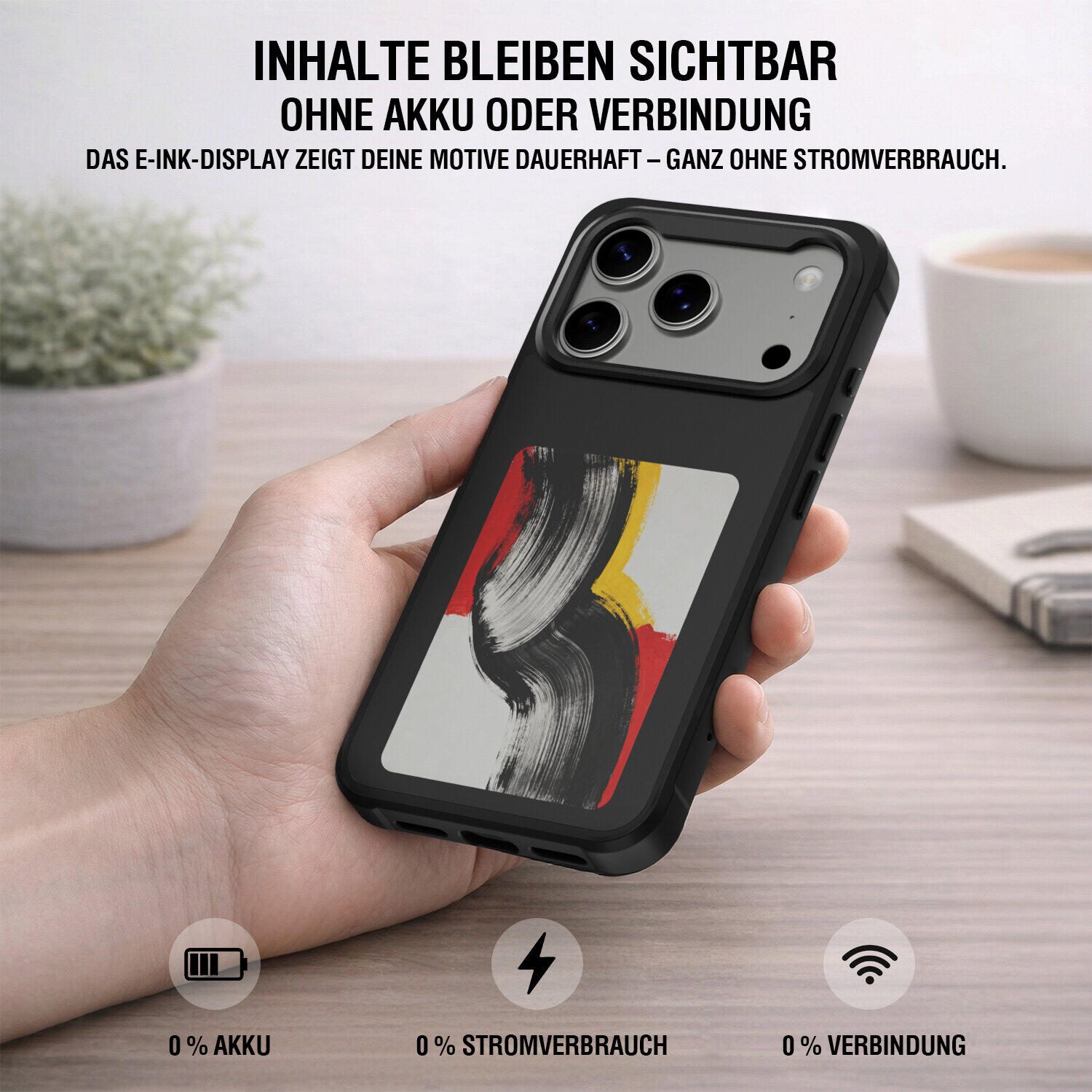Das E-Ink-Display zeigt deine Motive, Texte oder Designs dauerhaft an – ganz ohne Stromverbrauch. Einmal aktualisiert, bleibt der Inhalt sichtbar, ohne Akku und ohne Verbindung. Im Gegensatz zu herkömmlichen Displays benötigt E-Ink keine dauerhafte Stromversorgung. Dein Bild bleibt stabil und unverändert, egal ob dein iPhone geladen ist oder nicht. So wird dein Cover zur dauerhaften Anzeige für persönliche Inhalte – bewusst unabhängig von Strom. Sichtbar im Alltag, ohne etwas zu verbrauchen.