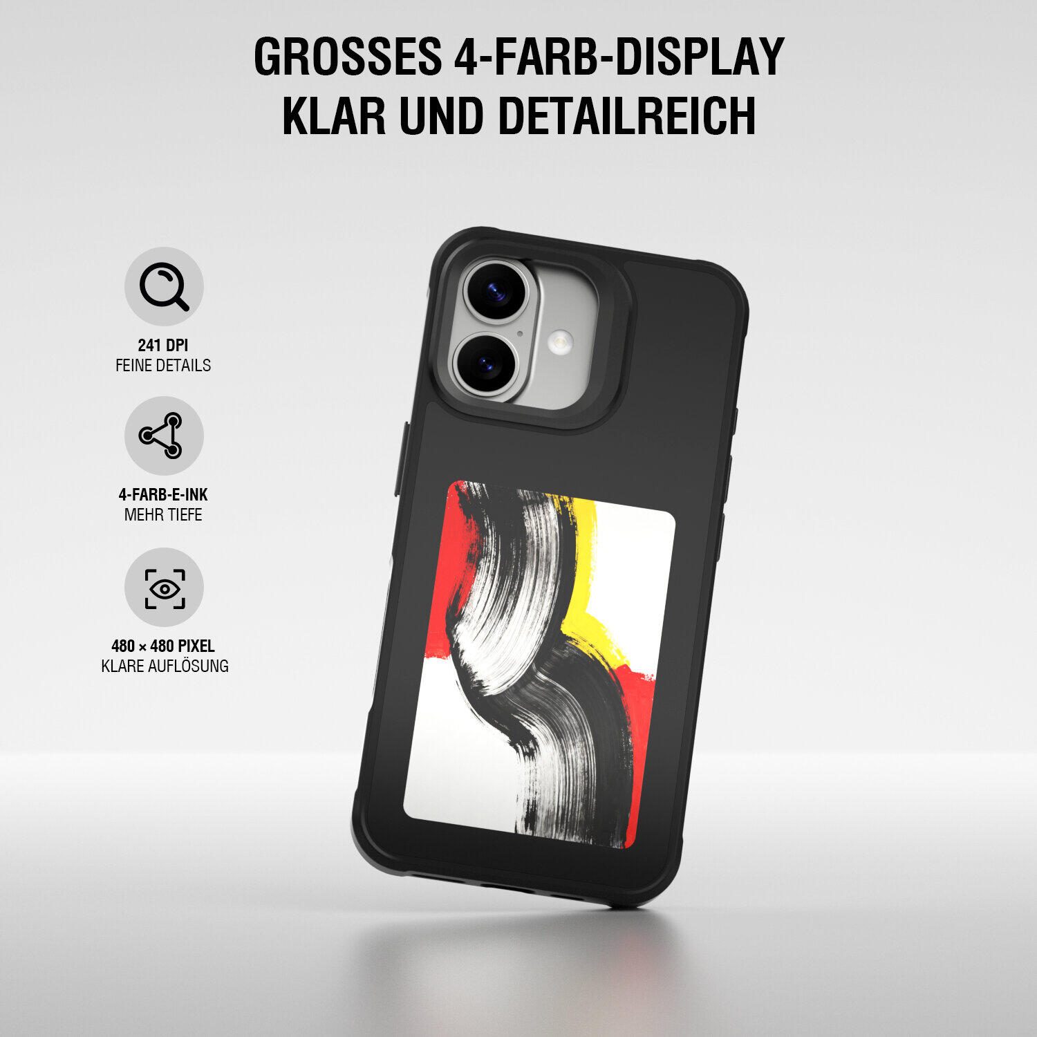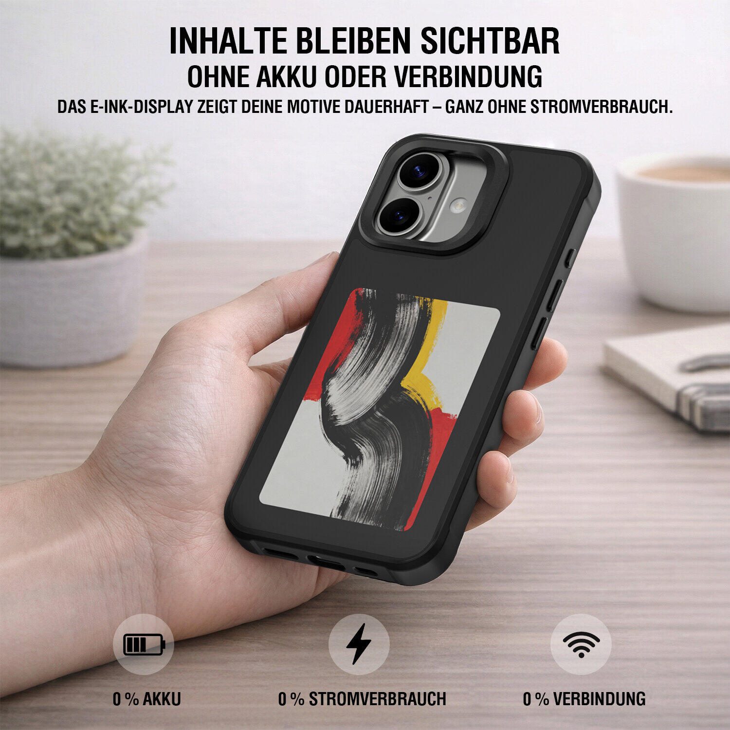 Das E-Ink-Display zeigt deine Motive, Texte oder Designs dauerhaft an – ganz ohne Stromverbrauch. Einmal aktualisiert, bleibt der Inhalt sichtbar, ohne Akku und ohne Verbindung. Im Gegensatz zu herkömmlichen Displays benötigt E-Ink keine dauerhafte Stromversorgung. Dein Bild bleibt stabil und unverändert, egal ob dein iPhone geladen ist oder nicht. So wird dein Cover zur dauerhaften Anzeige für persönliche Inhalte – bewusst unabhängig von Strom. Sichtbar im Alltag, ohne etwas zu verbrauchen.