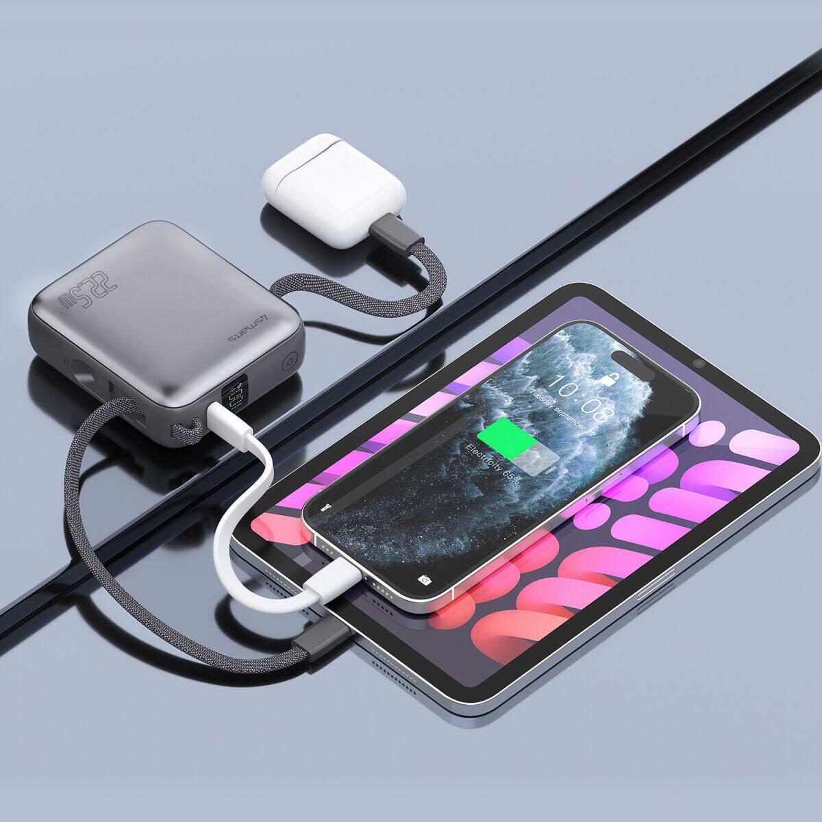 Die Powerbank bringt zwei fest verbaute USB-C Kabel und einen zusätzlichen Port mit. Das primäre Kabel mit bis zu 22,5 W eignet sich perfekt zum Schnellladen deines Smartphones und kann bei Bedarf sogar die Powerbank selbst aufladen. Das zweite Kabel ist ideal, um kleinere Geräte wie TWS-Kopfhörer oder deine Smartwatch zuverlässig mit Strom zu versorgen. Über den zusätzlichen USB-C Port lädst du parallel ein Tablet oder ein zweites Smartphone. So hast du immer die passende Lösung zur Hand – ohne zusätzliches Kabel-Chaos.