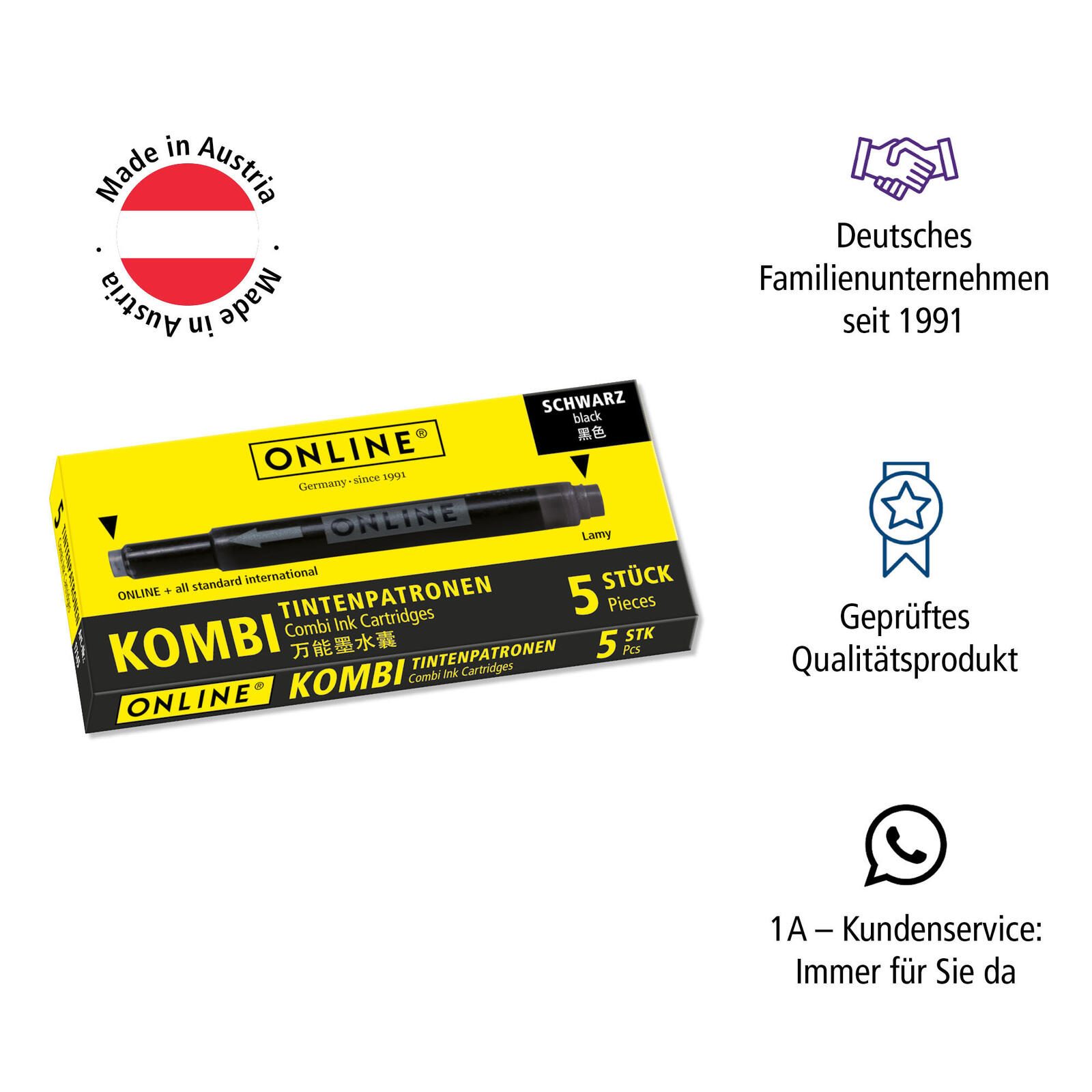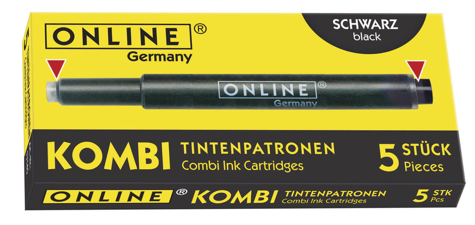 Die ONLINE® Tintenpatronen für Füller in der eleganten Farbe schwarz bieten eine vielseitige Lösung für deine Schreibbedürfnisse. Dieses Set enthält fünf hochwertige Kombi-Tintenpatronen, die speziell entwickelt wurden, um sowohl für dünne als auch für dicke Schreibseiten optimal geeignet zu sein. Die dünne Seite der Patrone passt perfekt in alle ONLINE und Standard-Füller, während die dicke Seite für Lamy Füller konzipiert ist. Die intensive schwarze Tinte sorgt für einen klaren und präzisen Schriftzug, der sich ideal für Notizen, Zeichnungen oder kreative Schreibprojekte eignet. Dank der hohen Farbbrillanz und der schnellen Trocknungszeit wird ein Verschmieren der Tinte vermieden, was dir ein sauberes und professionelles Ergebnis garantiert. Die einfache Handhabung der Tintenpatronen ermöglicht einen schnellen Wechsel, sodass du ohne Unterbrechung weiterarbeiten kannst. Egal, ob du im Büro, in der Schule oder zu Hause schreibst, die ONLINE® Tintenpatronen unterstützen dich dabei, deine Gedanken mühelos und stilvoll festzuhalten. Mit diesen Patronen erhältst du nicht nur ein Produkt von hoher Qualität, sondern auch die Flexibilität, verschiedene Füller zu nutzen. Die ONLINE® Tintenpatronen sind die ideale Wahl für alle, die Wert auf ein reibungsloses und ansprechendes Schreiberlebnis legen.Technische Daten