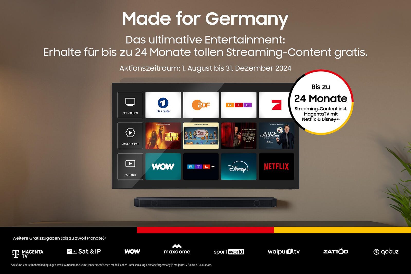 ¹ Die Kanäle können je nach Land variieren und können ohne Vorankündigung geändert werden. ² Die unterstützten Samsung Geräte können je nach Land variieren. ³ Erfordert ein Samsung-Konto. ⁴ Die Benutzeroberfläche kann ohne vorherige Ankündigung geändert werden. ⁵ Auf Samsung TV Plus kann Werbung erscheinen. ⁶ Seit 2016 kostenlos auf Samsung Smart TVs verfügbar.