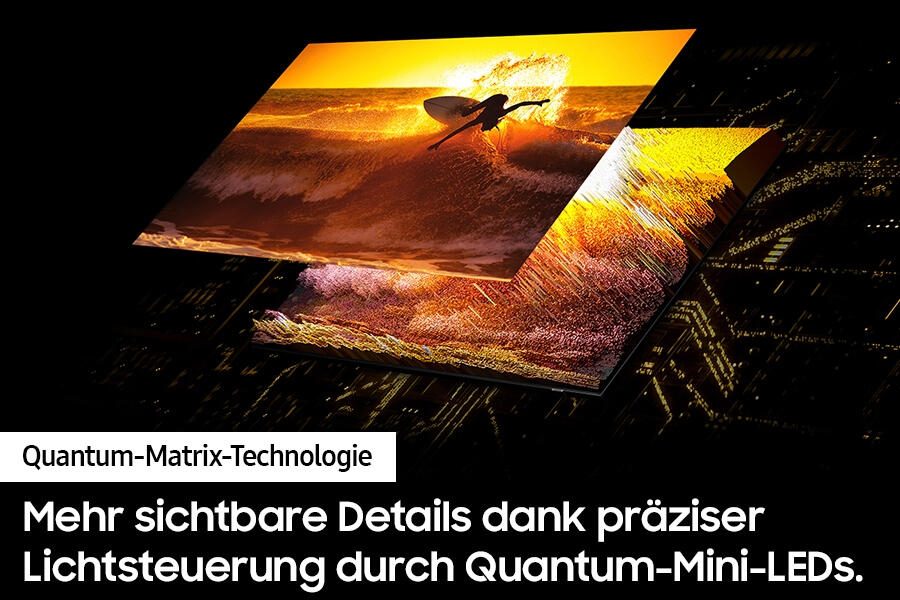 Dank der Quantum-Matrix-Technologie eröffnen sich dir faszinierende Bildwelten voller Kontraste und Details. Weiterhin werden tiefe Schwarz- und reine Weißtöne erzeugt, indem die leistungsstarke Beleuchtungssteuerung die einzelnen Quantum-Mini-LEDs mit hoher Genauigkeit ansteuert.