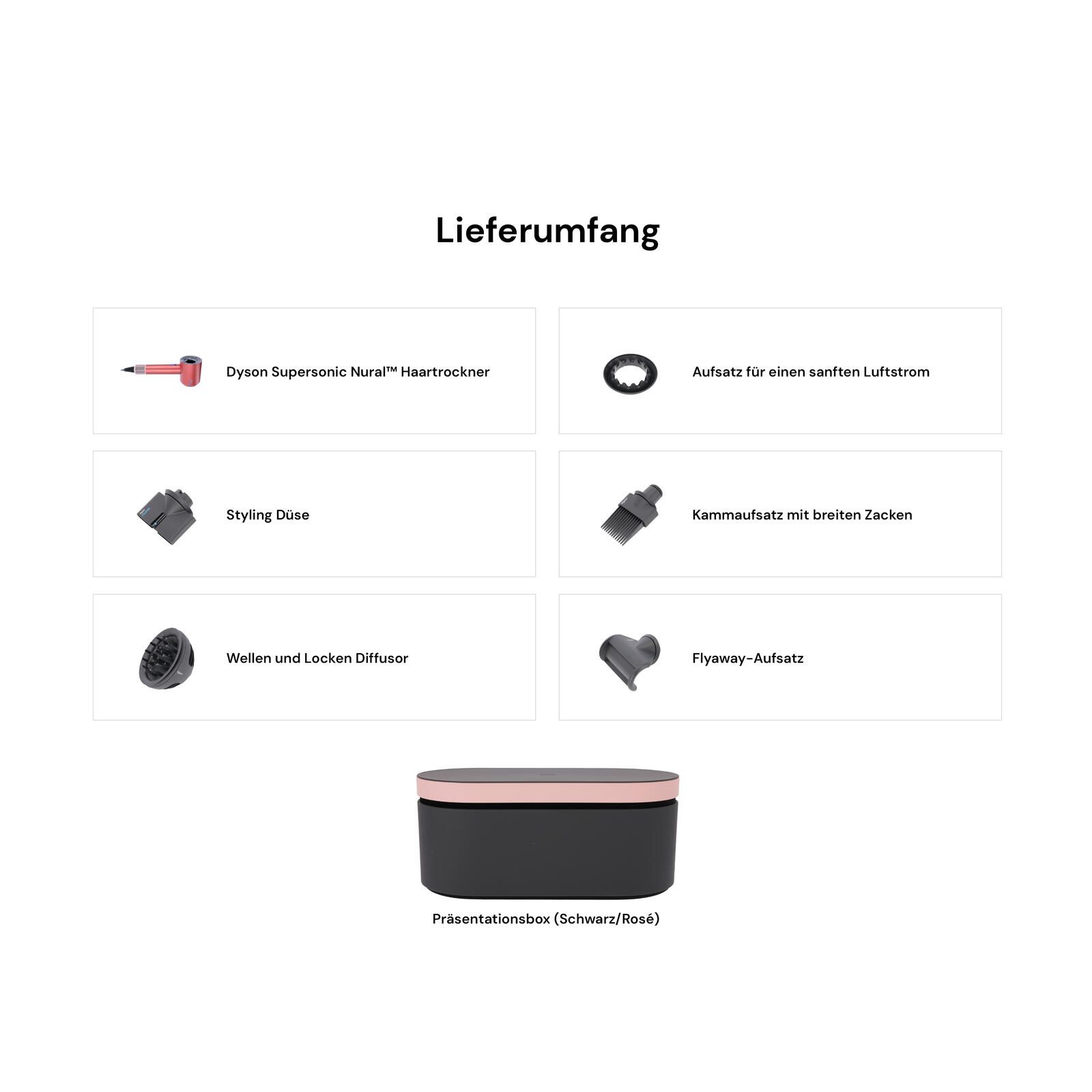 Der Dyson Supersonic™ Haartrockner wird mit magnetischen Aufsätzen geliefert, die schnell und einfach befestigt werden können.