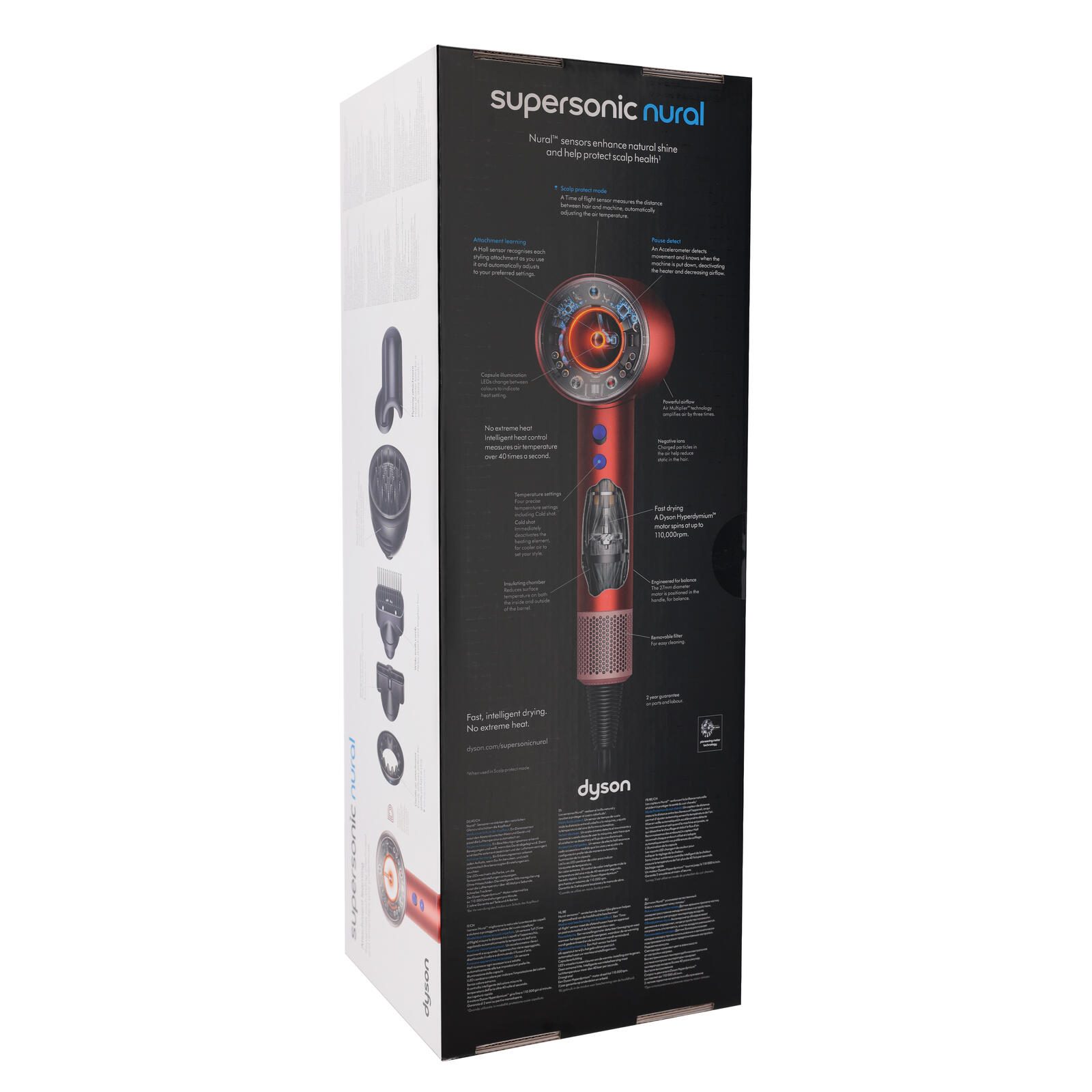Die Air Multiplier Technologie verdreifacht das Volumen der angesaugten Luft. Für ein schnelleres Trocknen. Schnelles Trocknen - Der Digitale Motor V9 läuft mit bis zu 110.000 U/min. Und er ist klein genug, um im Griff Platz zu finden, sodass das Gerät gut in der Hand liegt