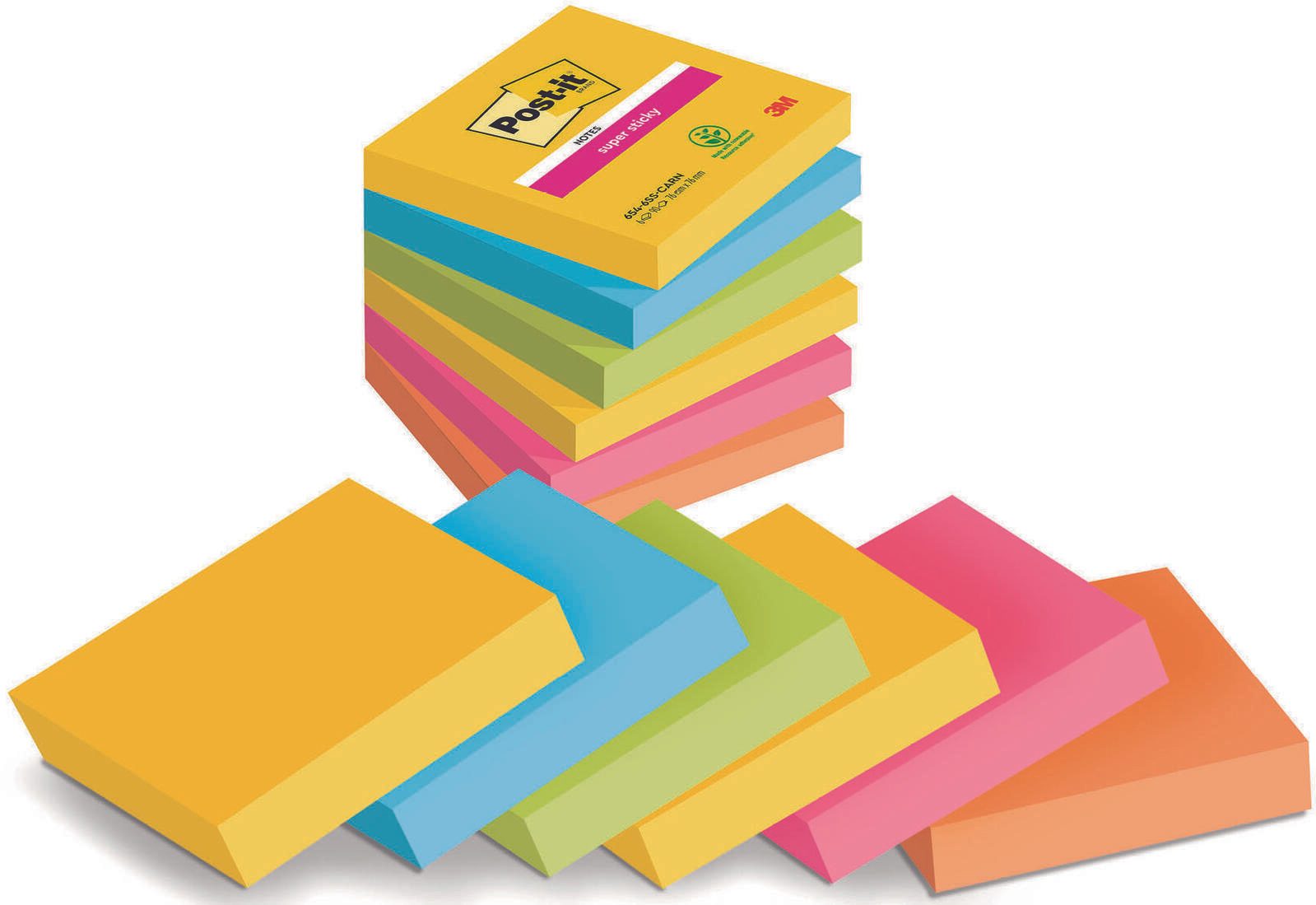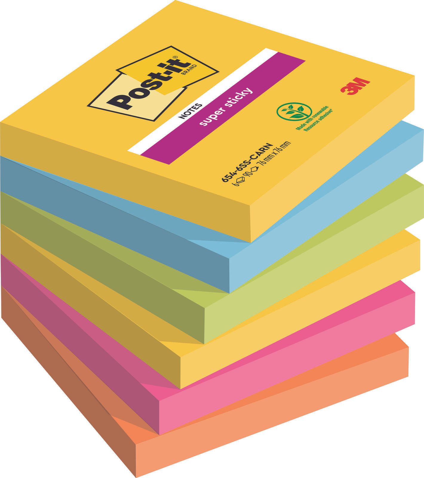 Die Post-it® Super Sticky Rio de Janeiro Haftnotizen sind die perfekte Lösung für deine Notizen, Erinnerungen und Ideen. Mit einer praktischen Größe von 7,6 x 7,6 cm bieten sie ausreichend Platz für deine Gedanken und sind gleichzeitig kompakt genug, um überallhin mitgenommen zu werden. Diese Haftnotizen sind in einer Vielzahl von lebendigen Farben erhältlich, darunter neongelb, -blau, -grün, -pink und -orange. Dadurch bringen sie nicht nur Farbe in deinen Alltag, sondern helfen dir auch, wichtige Informationen schnell und einfach zu kennzeichnen. Die extrastarke Haftung dieser Notizen sorgt dafür, dass sie auch auf schwierigen Oberflächen zuverlässig haften. Ob an Wänden, Bildschirmen oder in Notizbüchern – du kannst dir sicher sein, dass deine Botschaften an Ort und Stelle bleiben. Jeder Block enthält 90 Blätter, sodass du genügend Raum für all deine wichtigen Notizen hast. Zudem sind die Haftnotizen in einem praktischen Blockformat erhältlich, was die Handhabung und das Abreißen der Blätter besonders einfach macht. Die Post-it® Super Sticky Haftnotizen sind nicht nur funktional, sondern auch ein echter Hingucker. Ihre auffälligen Farben machen sie zu einem idealen Werkzeug für kreative Köpfe, die ihre Ideen visuell festhalten möchten. Egal, ob du sie im Büro, in der Schule oder zu Hause verwendest, diese Haftnotizen bringen Struktur und Farbe in deinen Alltag. Mit insgesamt 6 Blöcken pro Packung hast du ausreichend Nachschub, um all deine Gedanken festzuhalten. Vertraue auf die Qualität von Post-it® und genieße die Vorteile dieser vielseitigen Haftnotizen, die dir helfen, organisiert zu bleiben und deine Kreativität auszuleben.Technische Daten