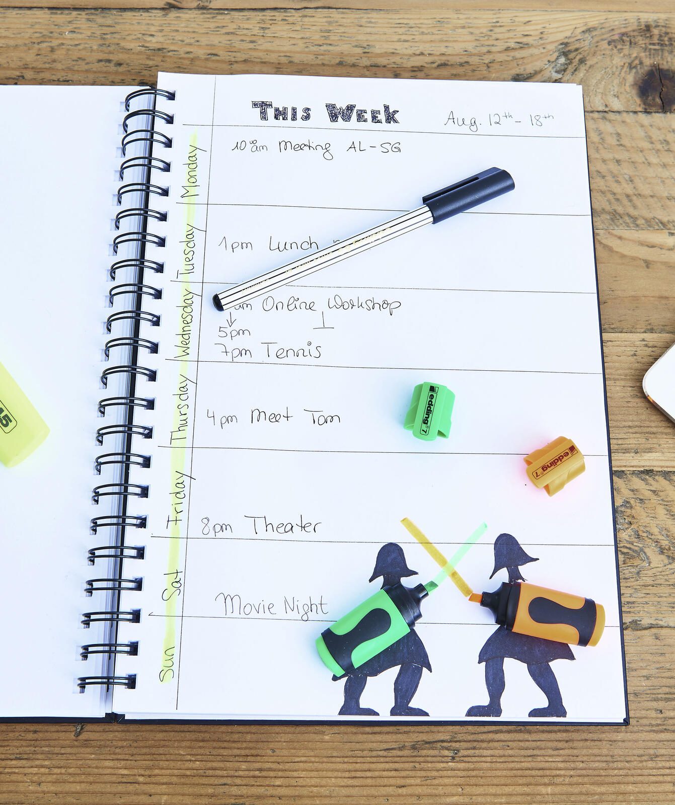 - Schreibfarbe: hellblau, pink, violett, braun, orange, gelb, grün, blau, rot, schwarz