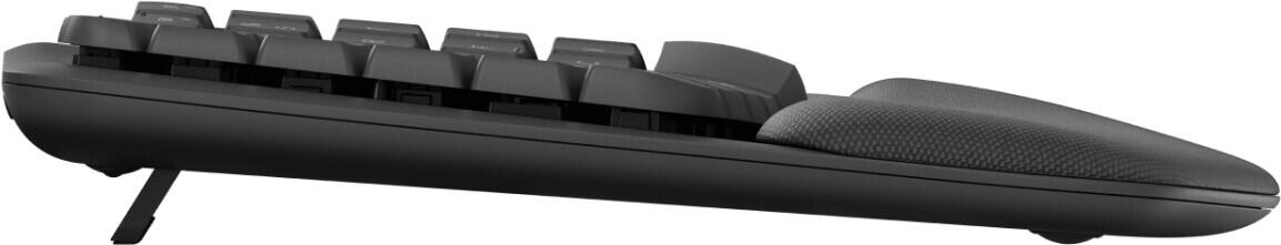 Unterstützen Sie das Wohlbefinden mit einer ergonomischen Tastatur, die den Arbeitskomfort der Mitarbeiter erhöht, ohne die Effizienz zu beeinträchtigen. Das geschwungene Design und die mit Memory Foam gepolsterte Handballenauflage bringen Ihre Handgelenke und Unterarme in eine natürlichere und entspanntere Position. Das ermöglicht flüssiges und einfaches Tippen.