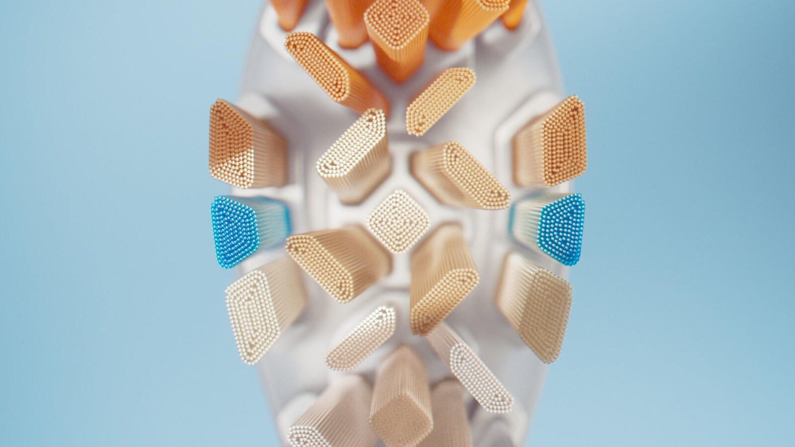 Mit diesen dreieckigen Spitzen entfernen Sie Verfärbungen effizienter als mit abgerundeten Borsten, da die Form mehr Kontakt mit der Zahnoberfläche ermöglicht. So werden Verfärbungen wirksam und schonend entfernt. - Besonders lange Borsten