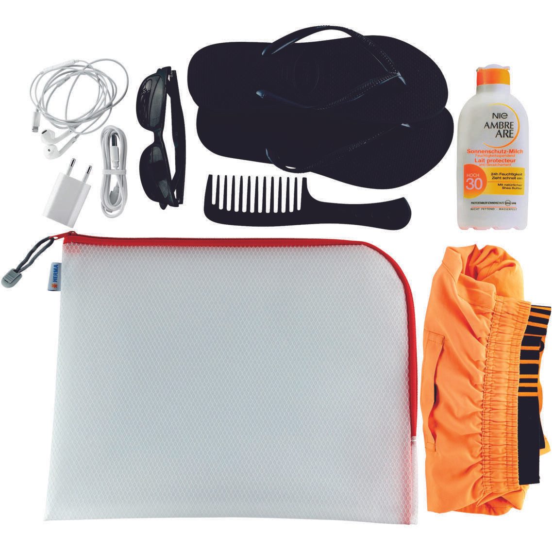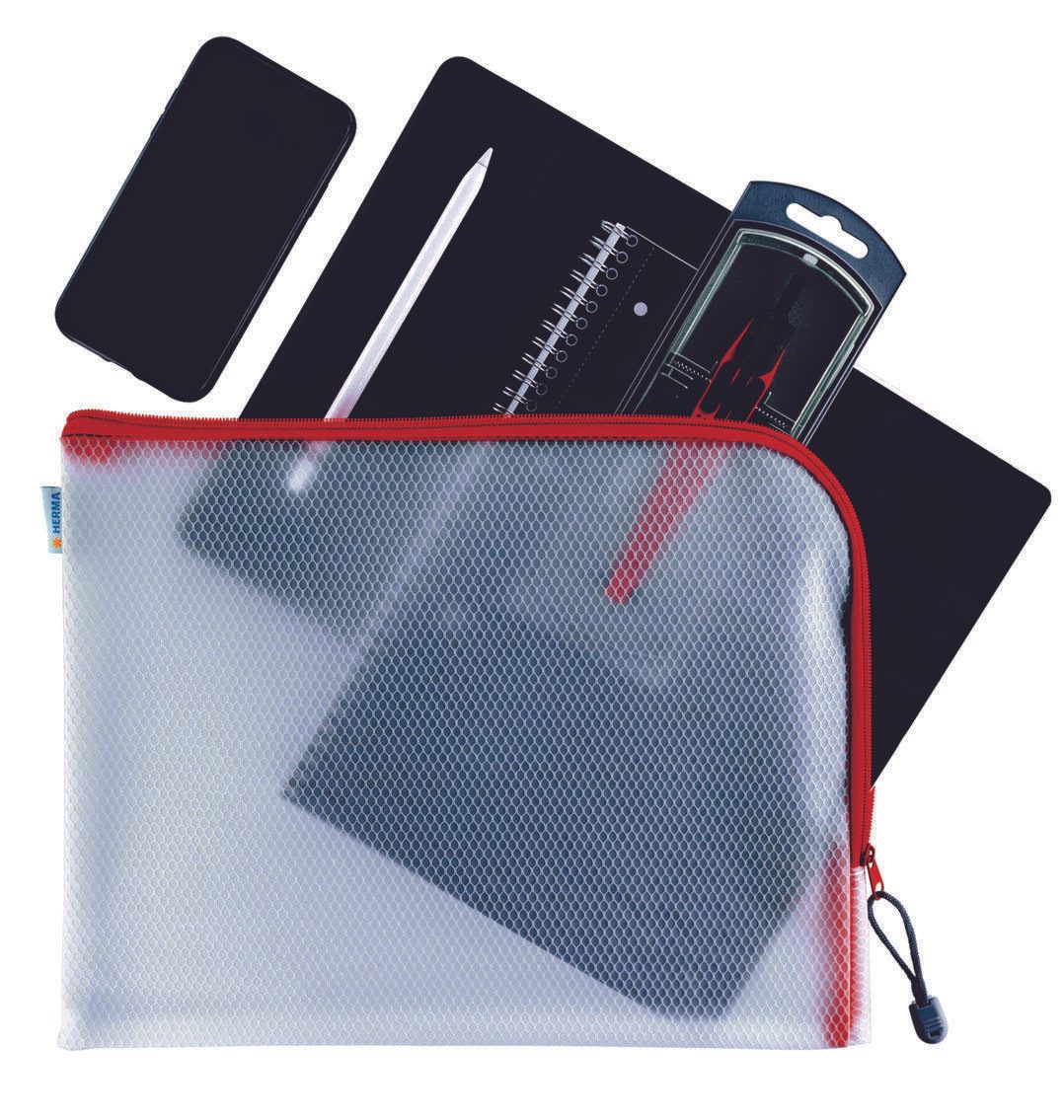 HERMA, der renommierte Hersteller, steht für zuverlässige Qualität und Funktionalität. Der Beutel kommt ohne Lochung aus und besitzt einen roten Reißverschluss, der nicht nur praktisch ist, sondern auch für einen schönen Kontrast zur transparenten Farbe sorgt.