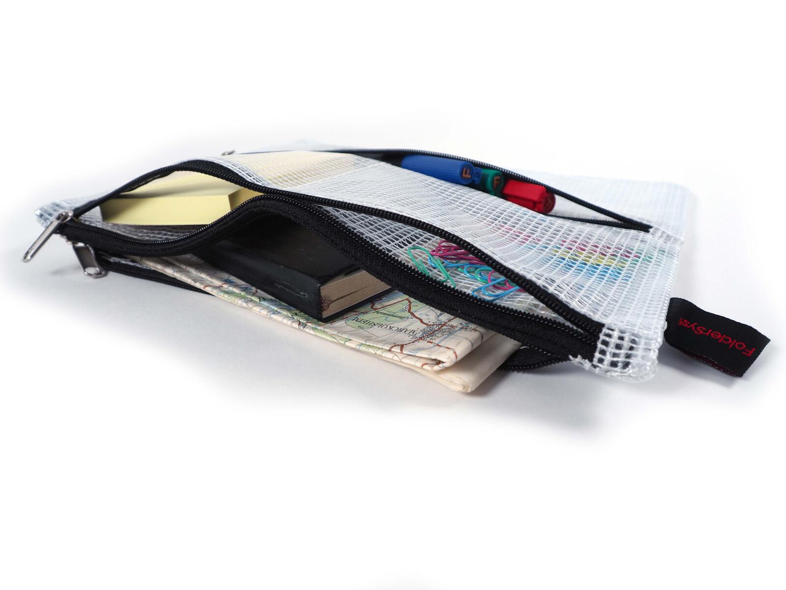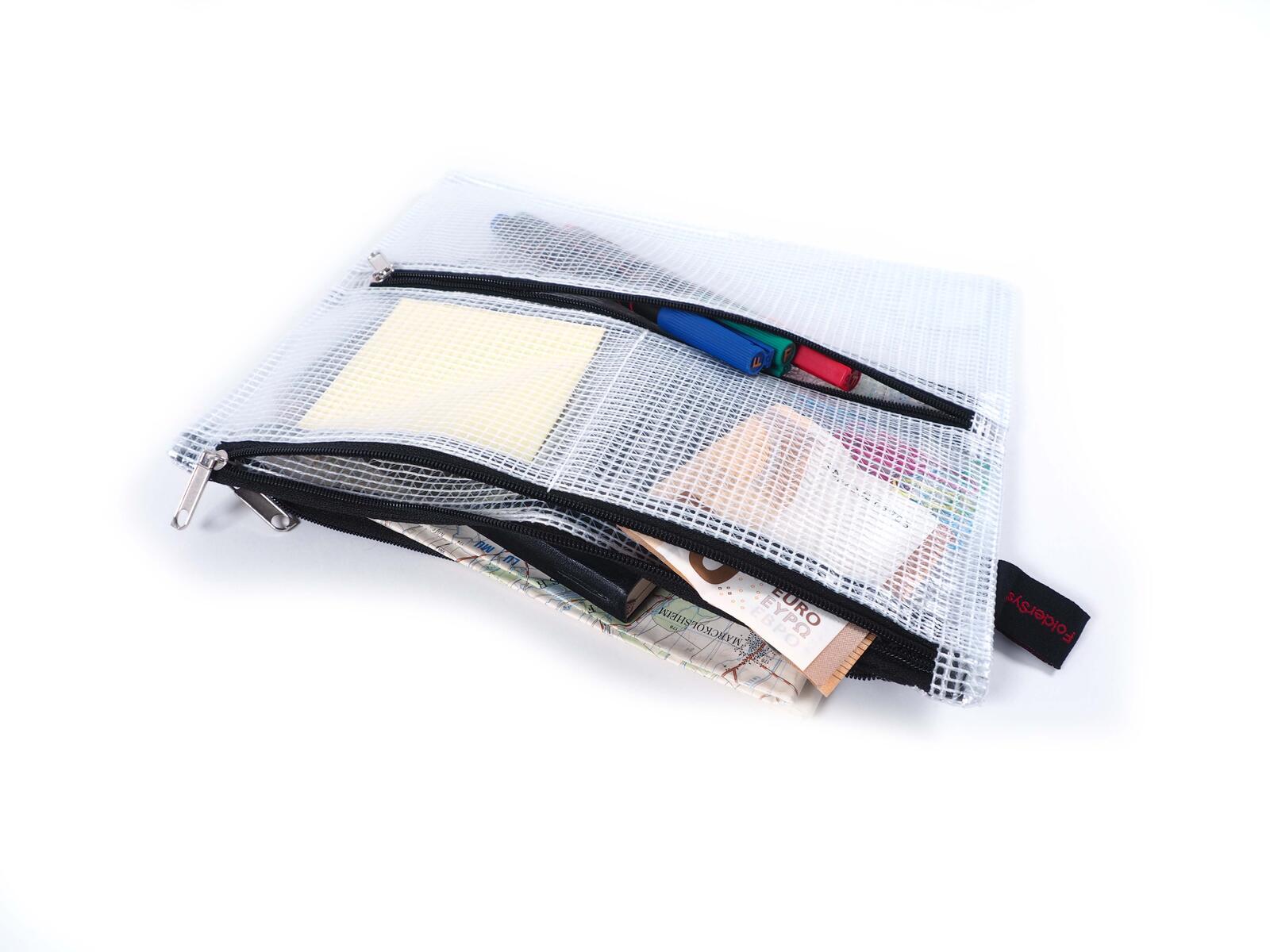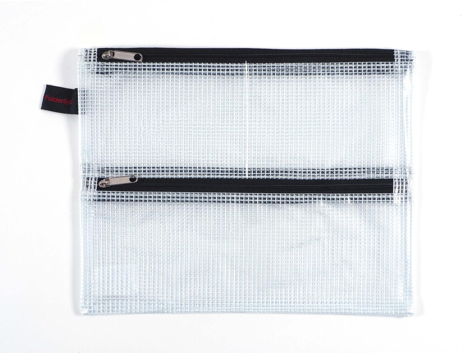 Der FolderSys Reißverschlussbeutel A5 transparent ist die ideale Lösung für die sichere und übersichtliche Aufbewahrung deiner Dokumente. Mit seiner transparenten Farbe ermöglicht er eine schnelle Identifikation des Inhalts, während der robuste Reißverschluss dafür sorgt, dass alles sicher an seinem Platz bleibt. Der Beutel bietet eine durchdachte Aufteilung mit einer Kammer für DIN A5, einer Kammer für LangDIN und zwei Kammern für DIN A7, sodass du verschiedene Formate problemlos organisieren kannst. Hergestellt aus PVC-faserverstärktem Material, vereint dieser Reißverschlussbeutel Langlebigkeit und Flexibilität. Die Innenmaße von 23,5 cm x 19 cm und die Außenmaße von 24,5 cm x 20 cm bieten ausreichend Platz für deine Unterlagen, ohne dabei unnötig viel Platz in deinem Arbeitsbereich einzunehmen. Die praktische Lochung ist nicht vorhanden, was die Handhabung vereinfacht und die Stabilität des Beutels erhöht. Der FolderSys Reißverschlussbeutel ist nicht nur funktional, sondern auch ästhetisch ansprechend. Der schwarze Verschluss kontrastiert elegant mit dem transparenten Material und verleiht dem Beutel ein professionelles Aussehen. Egal, ob du ihn im Büro, in der Schule oder für persönliche Zwecke verwendest, dieser Beutel wird deine Dokumente stilvoll schützen und organisieren. Mit dem FolderSys Reißverschlussbeutel A5 transparent hast du eine zuverlässige und praktische Lösung für all deine Aufbewahrungsbedürfnisse. Er ist die perfekte Wahl für alle, die Wert auf Ordnung und Übersichtlichkeit legen.Technische Daten