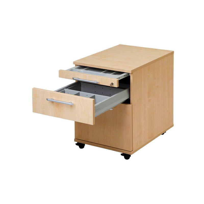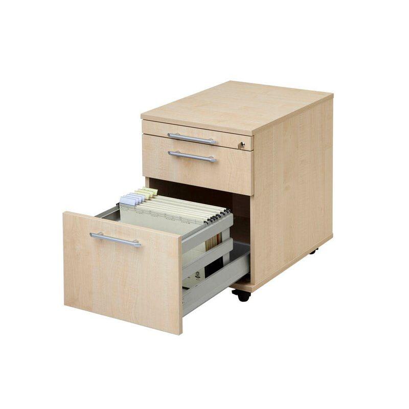 Der HAMMERBACHER Rollcontainer VAC20/3/3/RE in elegantem Ahorn-Design vereint Funktionalität und ansprechende Ästhetik. Mit seinen kompakten Maßen von 42,8 x 58,0 x 59,0 cm passt er perfekt in jedes Büro oder Home-Office und bietet gleichzeitig ausreichend Stauraum für deine Unterlagen und Büromaterialien. Die Schubladen sind mit hochwertigen Teleskop-Metall Kugelführungen ausgestattet, die über einen Selbsteinzug und Soft-Stopp verfügen. Dies gewährleistet ein sanftes und leises Öffnen und Schließen der Schubladen, was den Arbeitsalltag erheblich erleichtert. Zudem ist der Rollcontainer abschließbar, was für zusätzliche Sicherheit sorgt. Die Auszugssperre und die Feststellbremse bieten dir die nötige Stabilität, sodass der Container auch bei vollem Inhalt nicht verrutschen kann. Der Rollcontainer besteht aus robuster Spanplatte, die nicht nur langlebig ist, sondern auch eine pflegeleichte Oberfläche bietet. Der Relinggriff aus Kunststoff sorgt für eine komfortable Handhabung und ermöglicht ein einfaches Verschieben des Containers, während die ansprechende Ahornfarbe eine warme und einladende Atmosphäre schafft. Mit einem durchdachten Design und praktischen Funktionen ist der HAMMERBACHER Rollcontainer VAC20/3/3/RE die ideale Lösung für alle, die Wert auf Ordnung und Stil legen. Er bietet die perfekte Kombination aus Stauraum und Mobilität, sodass du deinen Arbeitsplatz individuell gestalten kannst, ohne auf Funktionalität verzichten zu müssen.Technische Daten