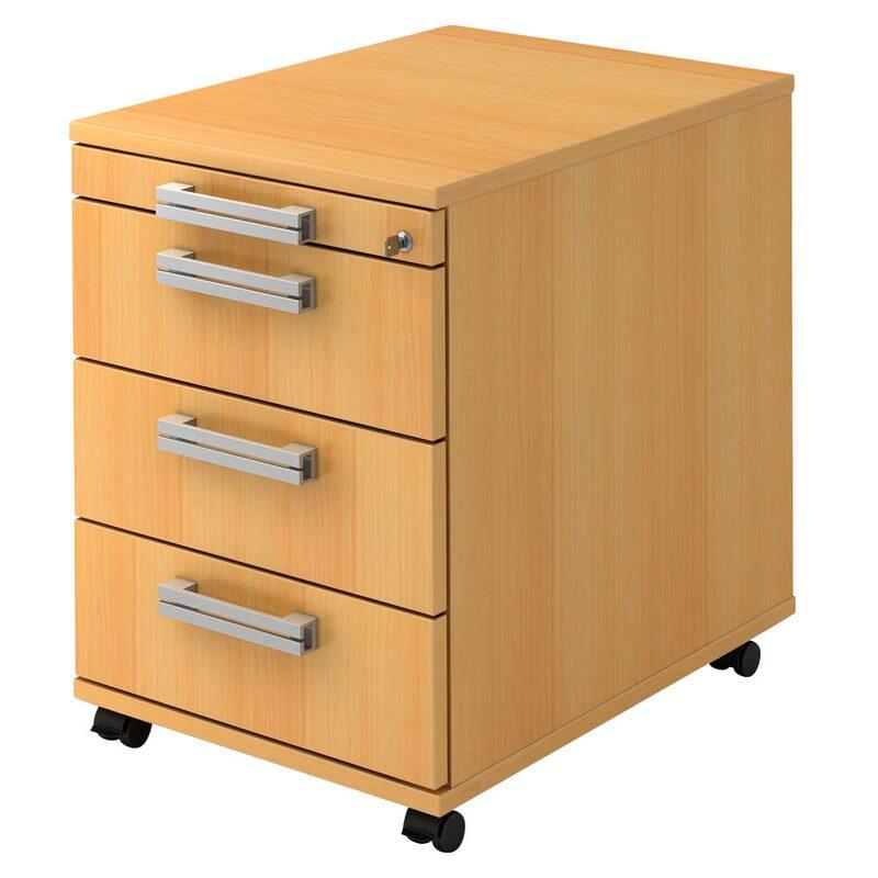 Der HAMMERBACHER Rollcontainer VAC30/6/6/NU in elegantem Buche-Finish ist die ideale Lösung für dein Büro oder Arbeitsbereich. Mit seinen kompakten Maßen von 42,8 x 58,0 x 59,0 cm passt dieser Rollcontainer perfekt unter jeden Schreibtisch und sorgt für Ordnung und Übersichtlichkeit. Der Rollcontainer ist aus hochwertiger Spanplatte gefertigt, was ihm nicht nur eine ansprechende Optik verleiht, sondern auch für Langlebigkeit und Stabilität sorgt. Ein besonderes Highlight dieses Rollcontainers ist die Ausführung mit Selbsteinzug und Soft-Stopp. Diese Funktion ermöglicht ein sanftes und leises Schließen der Schubladen, was besonders in ruhigen Arbeitsumgebungen von Vorteil ist. Du kannst dich darauf verlassen, dass deine Unterlagen sicher verstaut sind und gleichzeitig der Geräuschpegel niedrig bleibt. Der HAMMERBACHER Rollcontainer bietet drei geräumige Schubladen, die dir ausreichend Platz für Dokumente, Büromaterialien oder persönliche Gegenstände bieten. Die Relinggriffe aus robustem Stahl sorgen für eine einfache Handhabung und verleihen dem Rollcontainer eine moderne Note. Die ansprechende Buche-Farbe harmoniert zudem hervorragend mit verschiedenen Einrichtungsstilen und sorgt für eine warme Atmosphäre in deinem Raum. Dieser Rollcontainer gehört zur Serienbezeichnung AC30 und ist nicht nur funktional, sondern auch ein stilvolles Möbelstück, das deinem Arbeitsplatz zusätzlichen Charme verleiht. Mit dem HAMMERBACHER Rollcontainer VAC30/6/6/NU bist du bestens ausgestattet, um deine Arbeitsabläufe zu optimieren und gleichzeitig einen ästhetischen Akzent zu setzen.Technische Daten
