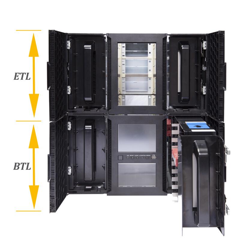 • Wartungsfreundliche und austauschbare Komponenten: Das Netzteil, der Library Controller, die Laufwerke und die Robotik sind vor Ort austauschbar, damit eine schnelle Wiederaufnahme des Betriebs gewährleistet ist.