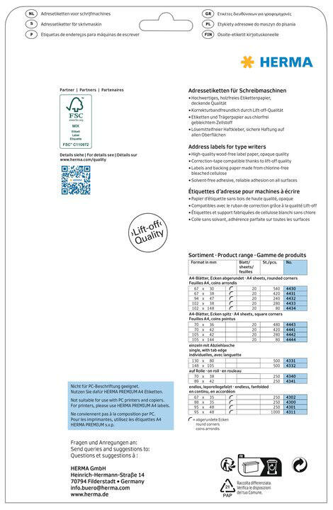 Die HERMA Adressetiketten in der Größe 67,0 x 38,0 mm bieten eine praktische Lösung für all deine Beschriftungsbedürfnisse. Mit einer Packung, die 420 Etiketten auf 20 Blatt enthält, bist du bestens ausgestattet, um Briefe, Pakete oder andere Sendungen professionell zu kennzeichnen. Diese hochwertigen Etiketten sind aus holzfreiem Papier gefertigt und zeichnen sich durch eine matte Oberfläche aus, die dir ermöglicht, sie mit einem Stift oder einer Schreibmaschine problemlos zu beschriften. Die selbstklebenden Etiketten haften zuverlässig auf verschiedenen Oberflächen, ohne dabei Rückstände zu hinterlassen. Mit abgerundeten Ecken bieten sie nicht nur eine ansprechende Optik, sondern auch eine verbesserte Handhabung. Die HERMA Adressetiketten sind in einem klassischen Weiß gehalten, was sie vielseitig einsetzbar macht und sich ideal für geschäftliche sowie private Anwendungen eignet. Ob für den Versand von Geschenken, die Organisation von Dokumenten oder das Etikettieren von Lagerbeständen – die HERMA Adressetiketten sind eine ausgezeichnete Wahl. Ihre blickdichte Beschaffenheit sorgt dafür, dass die Informationen klar und deutlich sichtbar sind, während die nicht bedruckbare Oberfläche dir die Freiheit lässt, kreativ zu sein und deine Beschriftungen individuell zu gestalten. Die Etiketten sind auf einem A4-Bogen angeordnet, was eine einfache Handhabung und Integration in deinen Arbeitsablauf ermöglicht. Mit diesen Adressetiketten von HERMA erhältst du ein Produkt, das nicht nur funktional ist, sondern auch in jedem Büro oder Zuhause einen Mehrwert bietet.Technische Daten