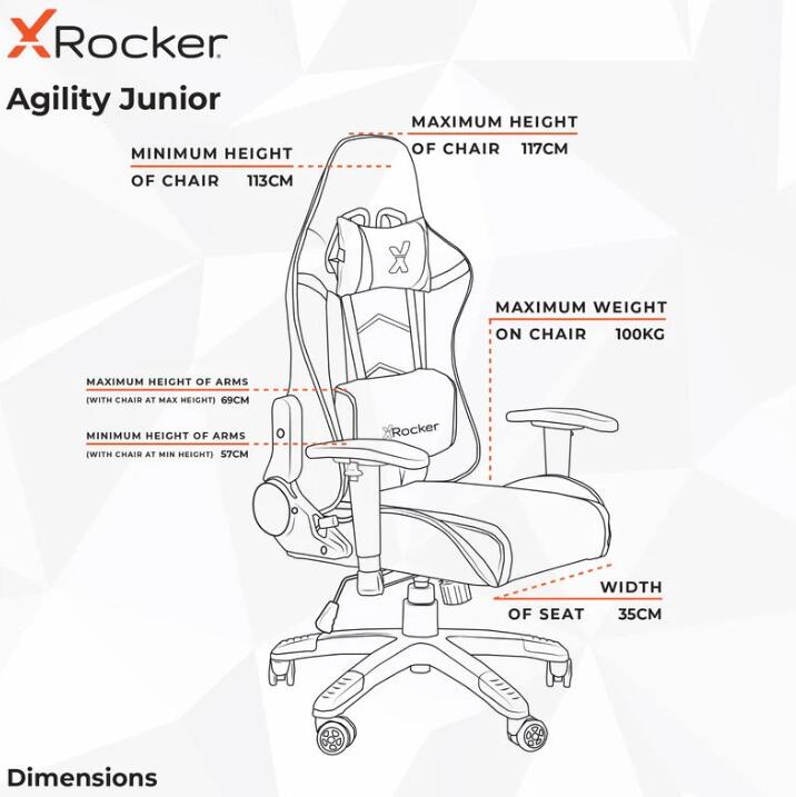 Der X Rocker Bürostuhl steht stabil auf einem Fußkreuz mit 5 Rollen und kann somit flexibel im Raum bewegt werden. Der X Rocker Agility Compact Gaming-Stuhl ist für ein maximales Belastungsgewicht von 100 kg ausgelegt.