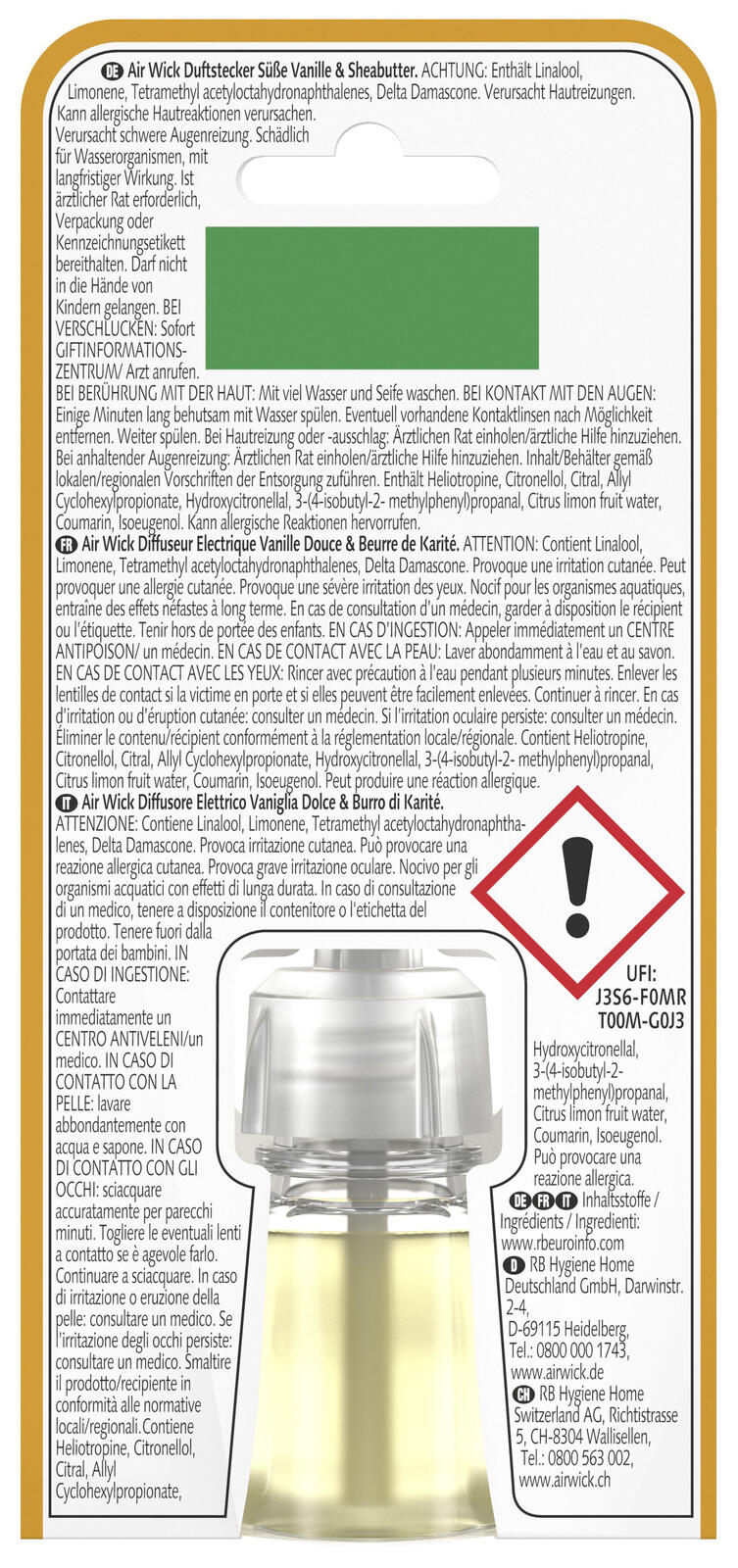 Der Nachfüller ist kompatibel mit allen AIRWICK Duftsteckern und bietet eine praktische Lösung, um den Duftspender immer wieder neu zu befüllen. Hergestellt von der RB Hygiene Home Deutschland GmbH, steht dieses Produkt für Qualität und Zuverlässigkeit. Für weitere Informationen und Kontaktmöglichkeiten kannst Du die offizielle Website von AIRWICK besuchen.