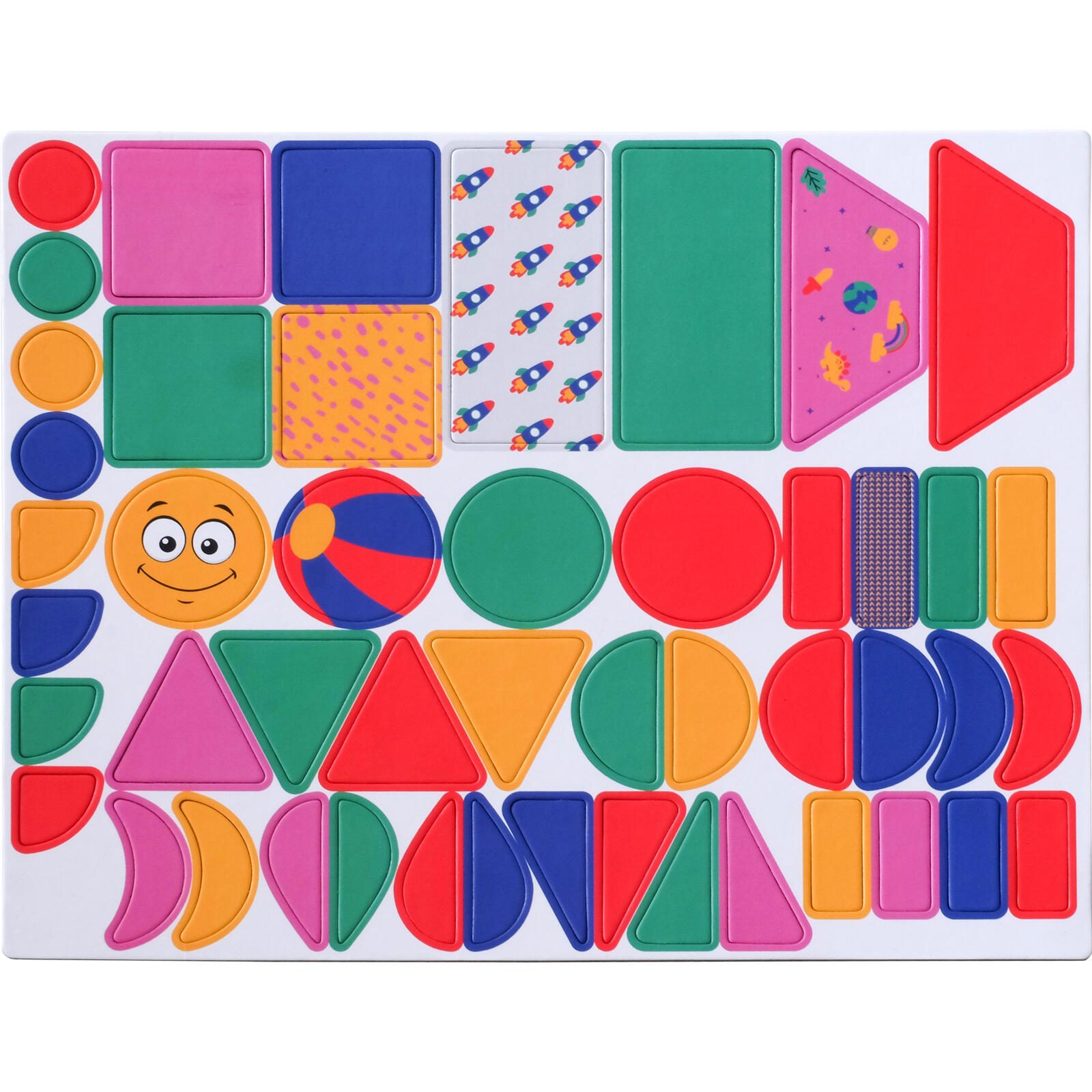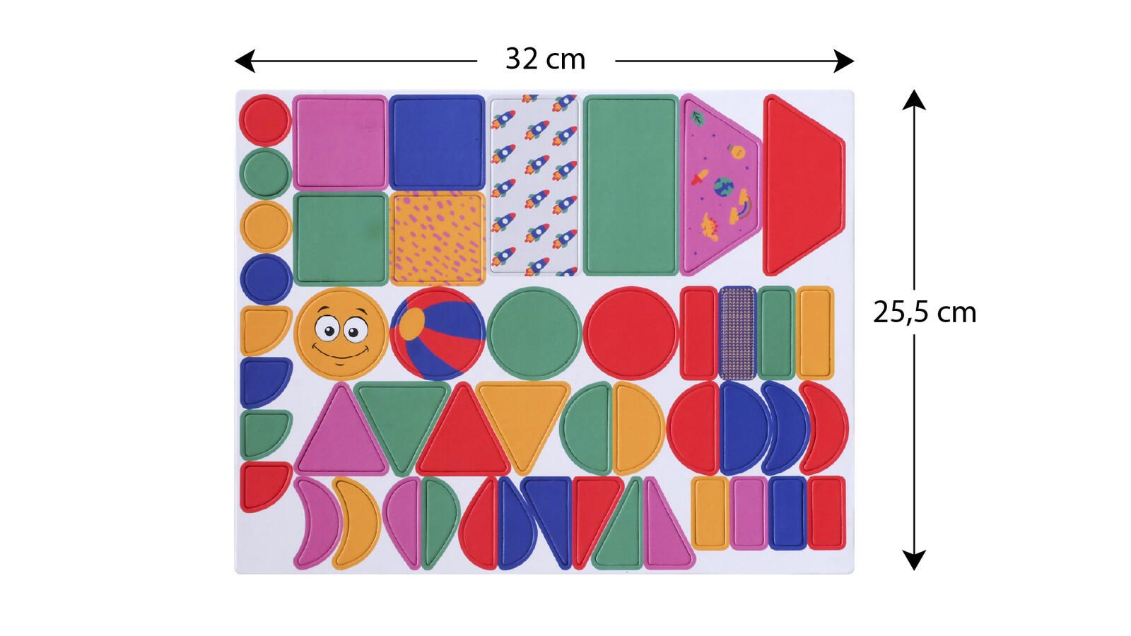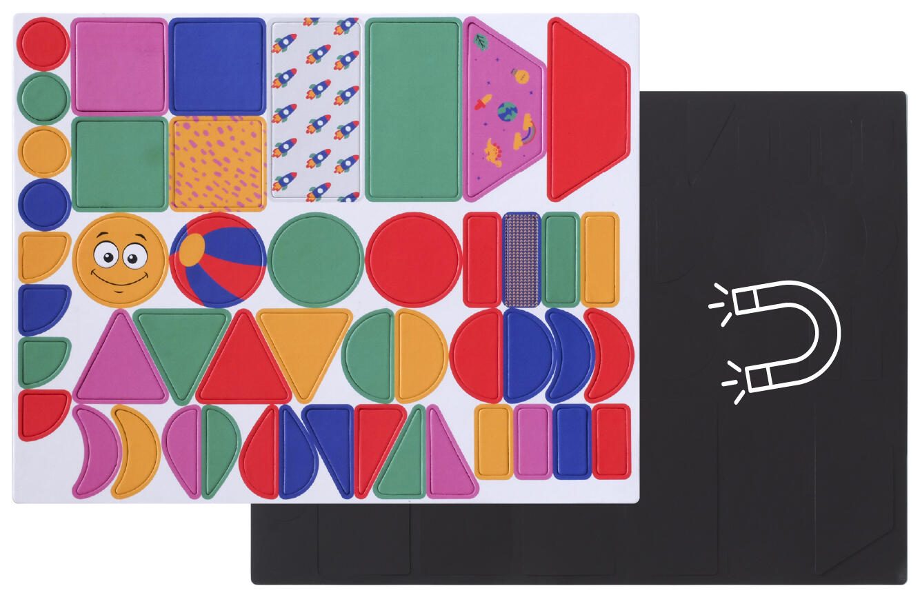 • 48 magnetische Elemente: Kreis, Dreieck, Quadrat, Rechteck, Halbkreis, Halbmond, Tropfen, Viertelkreis