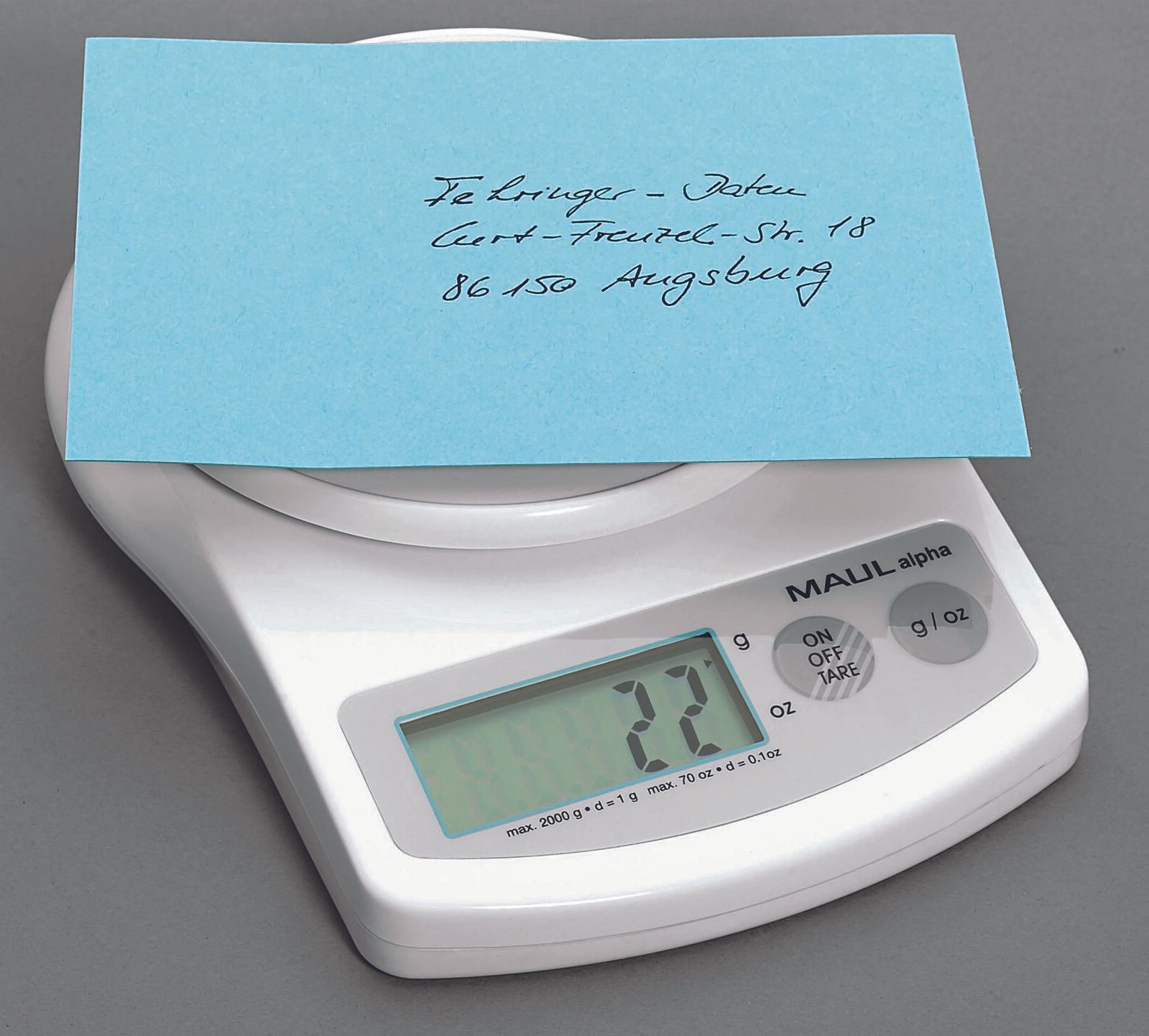 Die MAUL Briefwaage überzeugt nicht nur durch ihr Äußeres, sondern auch durch ihre Genauigkeit. Jedes Gramm zählt, und mit dieser Waage kannst du sicher sein, dass deine Postsendungen immer das korrekte Gewicht haben. Dank der einfachen Bedienung kannst du mühelos das Gewicht deiner Briefe überprüfen, sei es für den privaten oder den geschäftlichen Gebrauch.