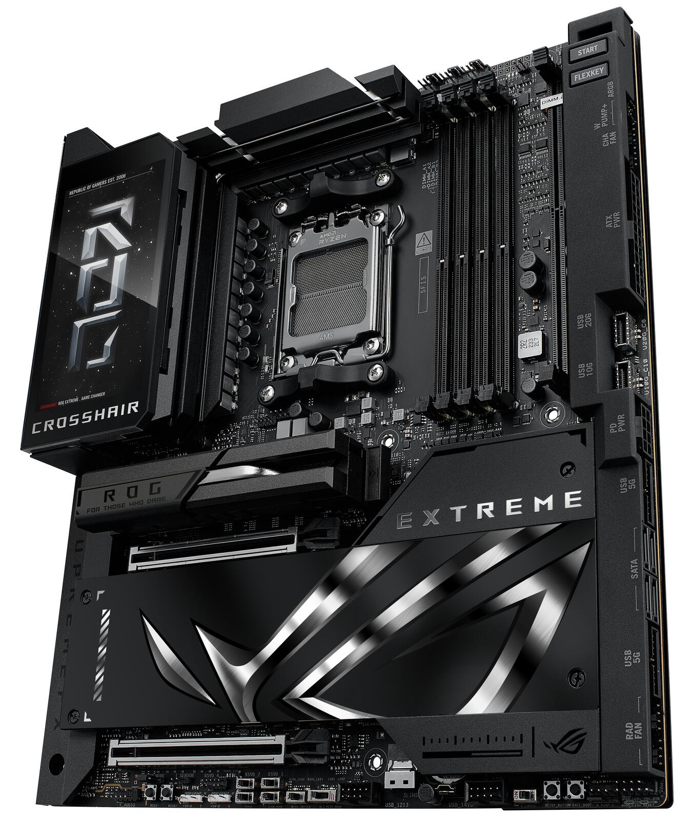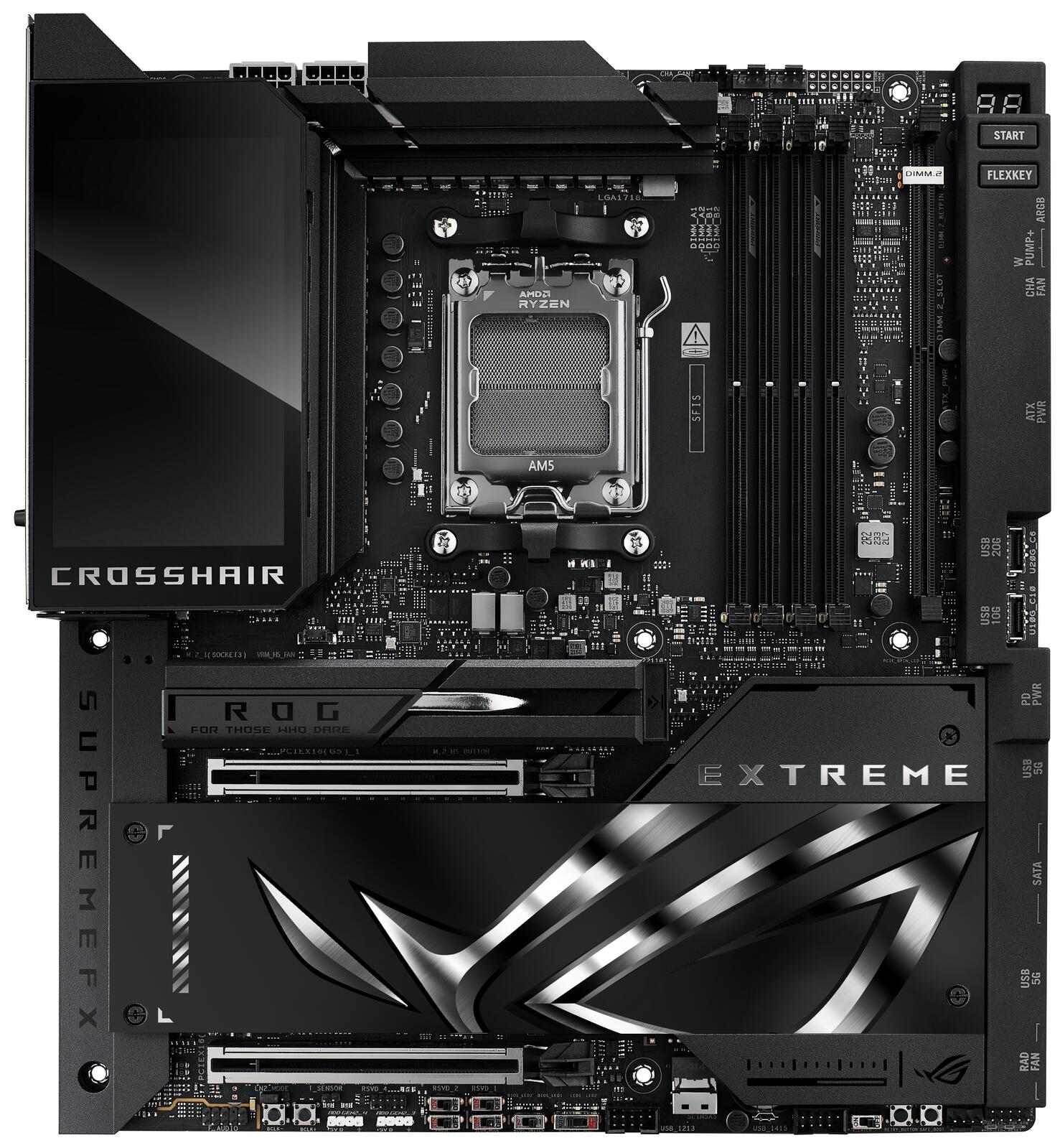Das ROG Crosshair X870E Extreme ist das Flaggschiff unter den AMD Ryzen™ 9000er Mainboards und wurde für die anspruchsvollsten Nutzer entwickelt. Es bietet die ultimative Grundlage für AM5-CPUs, DDR5-Speicher und PCIe® 5.0-Komponenten, um maximale Leistung und Zukunftsfähigkeit zu gewährleisten. Zu seinen umfassenden Anschlussmöglichkeiten gehört USB4®, und das integrierte 5-Zoll-LCD bietet eine einzigartige Möglichkeit, die Systemleistung zu überwachen oder dem System einen persönlichen Touch zu verleihen.