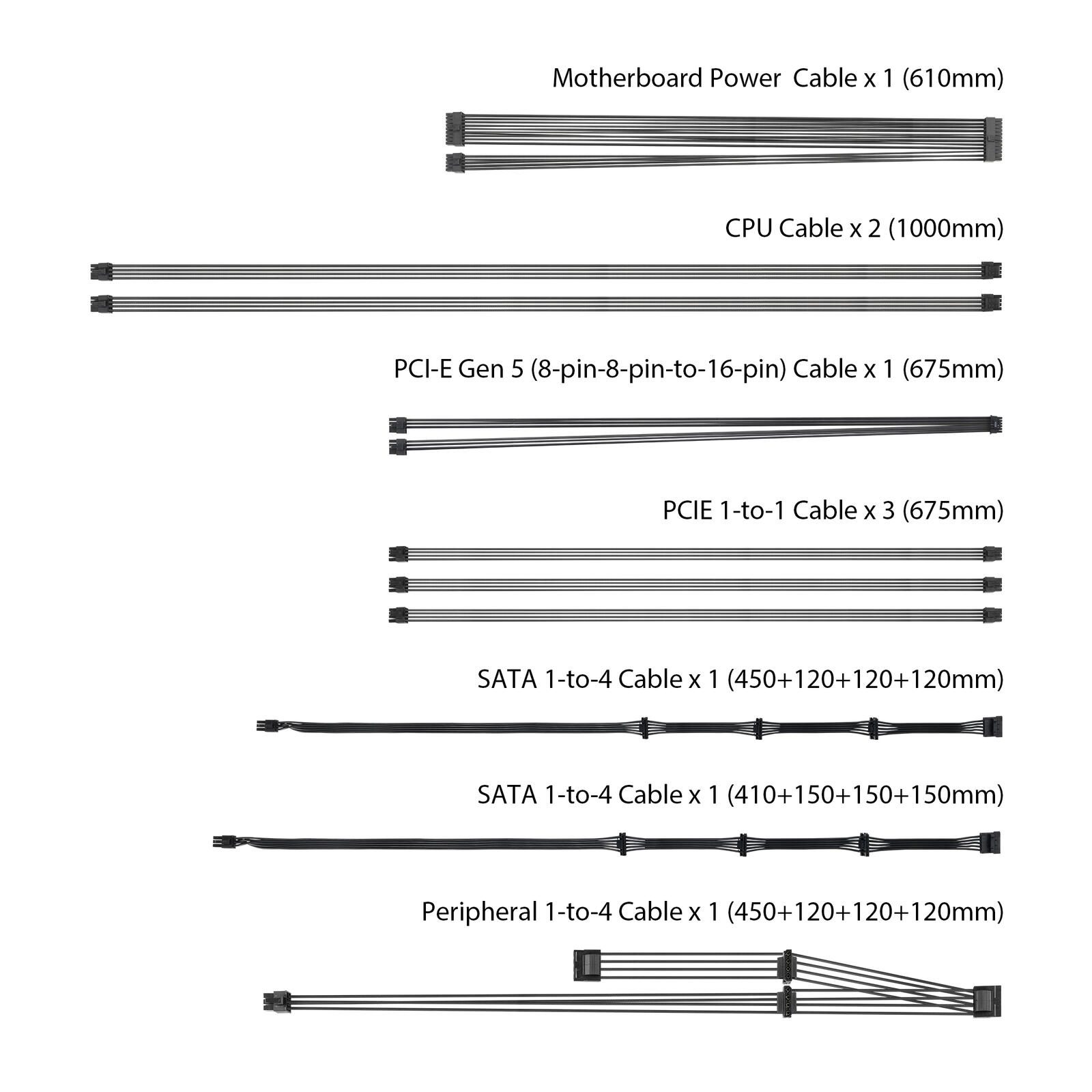 - 16-poliges PCIe-Kabel : Im Lieferumfang ist ein 12VHPWR-Kabel enthalten, das mit PCIe Gen 5.0 Grafikkarten kompatibel ist.