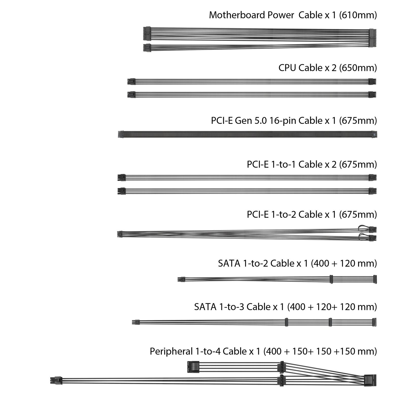 "Power Cord x 1 Motherboard Power Cable x 1 (610mm) CPU Cable x 2 (650mm) PCI-E Gen 5 16-pin Cable x 1 (675mm) PCI-E 1-to-1 Cable x 1 (675mm) PCI-E 1-to-2 Cable x 1 (675mm) SATA 1-to-2 Cable x 1 (400+120mm) SATA 1-to-3 Cable x 1 (400+120+120mm) Peripheral