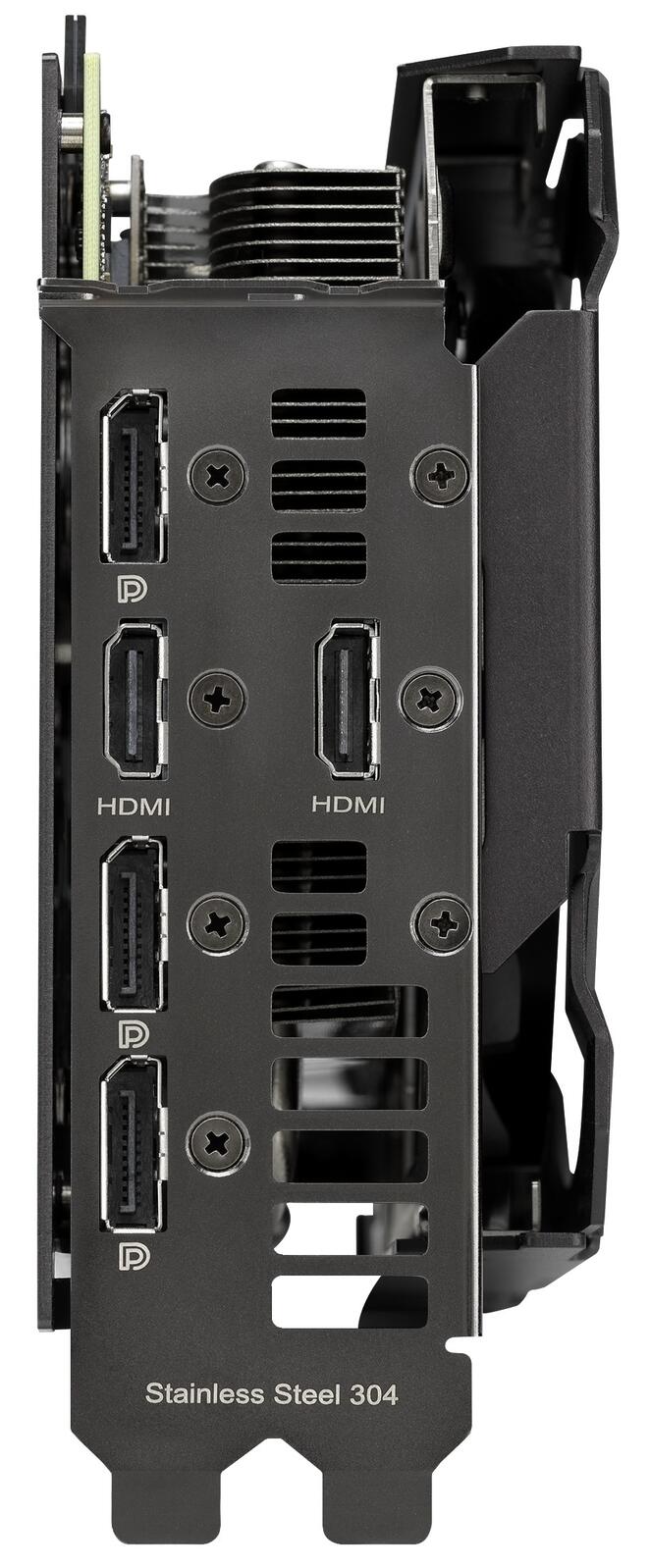 Die Unterseite der Karte offenbart eine Vielzahl von Verbesserungen. Der größte Teil der Rückseite ist von einer schützenden Backplate aus Metall bedeckt, die über eine markante, große Entlüftungsöffnung verfügt. Durch die Entlüftung kann die heiße Luft in Richtung der Gehäuselüfter entweichen, anstatt wieder in den Kühler zurückgeführt zu werden. Bei der Anschlussblende kommt Edelstahl zum Einsatz, um die Anschlüsse zu schützen und eine sicherere Befestigung zu garantieren. Und mit einem benutzerfreundlich platzierten Dual-Bios-Schalter kann das Standard-Leistungsprofil der Karte ohne Software angepasst werden.