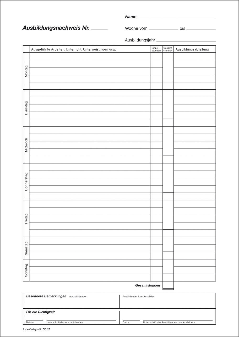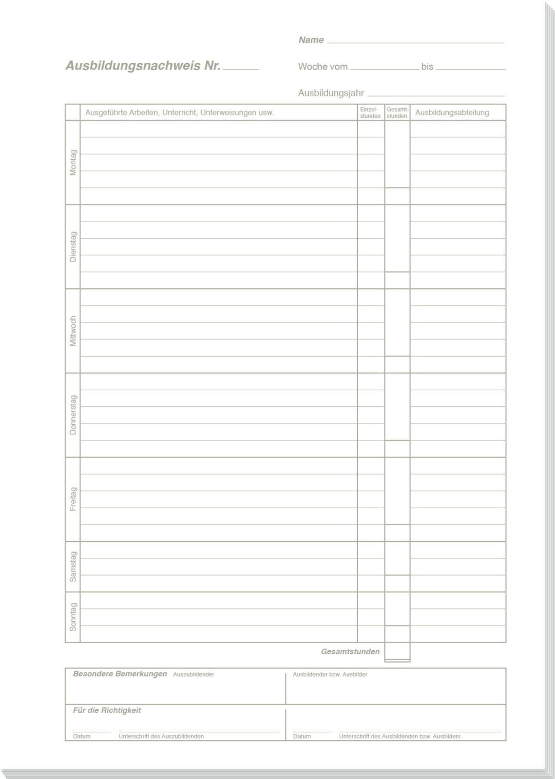 - Formular: Ausbildungsnachweis, tägliche Eintragungen