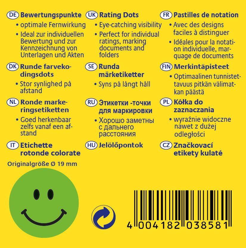 Das einzigartige Motiv in Form eines Gesichts verleiht jedem Dokument oder Projekt eine persönliche Note und sorgt für eine positive Atmosphäre. Die leuchtende grüne Farbe hebt sich deutlich ab und zieht die Aufmerksamkeit auf sich, was besonders in Schulen, bei Veranstaltungen oder in Büros von Vorteil ist. Mit der Verpackungsart in einer praktischen Spenderbox sind die Etiketten einfach zu entnehmen und zu verwenden.