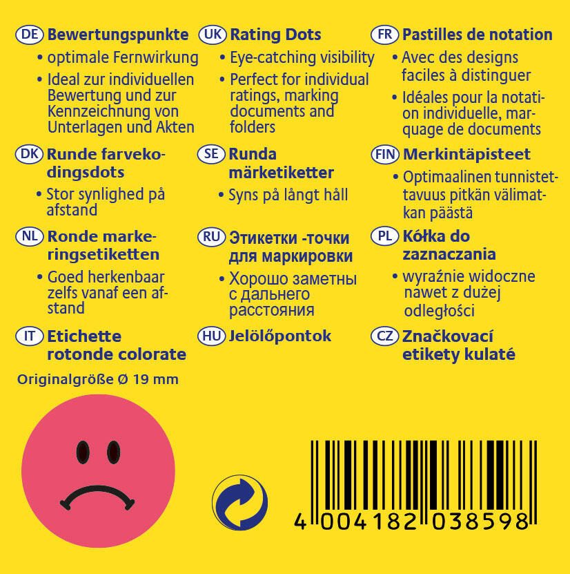 Die AVERY Zweckform Bewertungspunkte Gesicht sind eine praktische und ansprechende Lösung zur Visualisierung von Bewertungen und Feedback. Mit einem Durchmesser von rund und einer auffälligen roten Farbe, sind diese selbstklebenden Etiketten nicht nur funktional, sondern auch ein echter Blickfang. Jede Rolle enthält 250 Etiketten, die in einer handlichen Spenderbox geliefert werden, was die Anwendung besonders einfach und komfortabel macht.