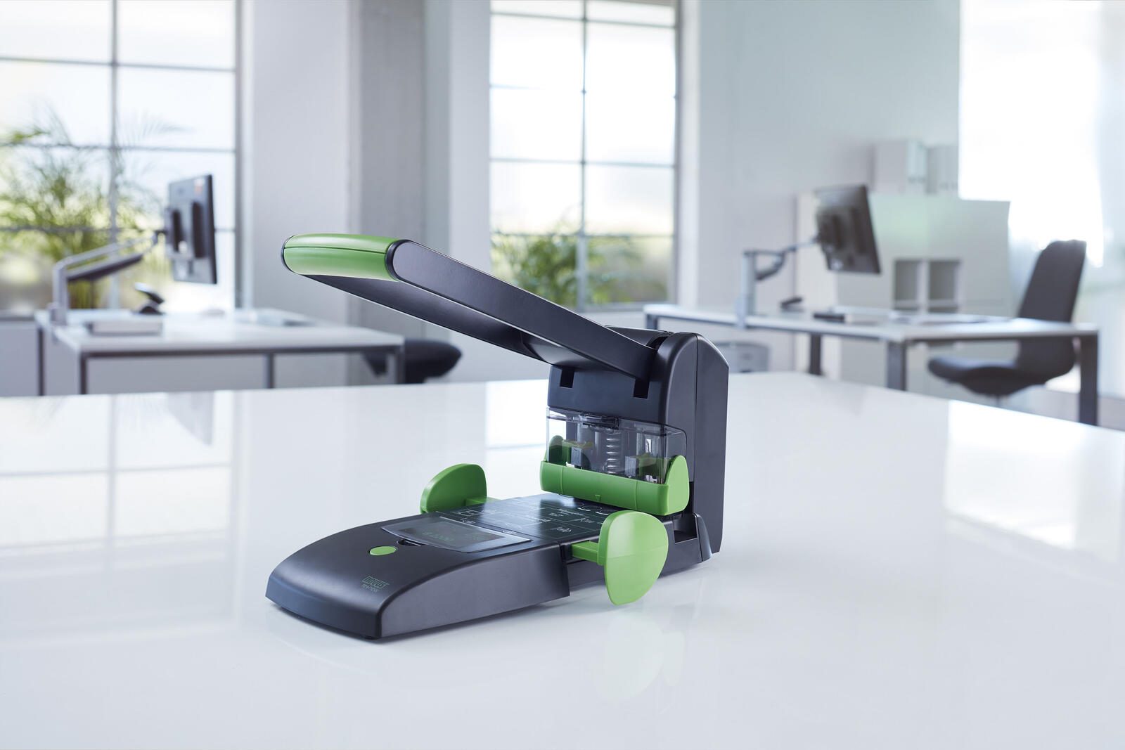 Der novus Registraturlocher B2200 re+new in elegantem schwarz/grün ist die ideale Lösung für alle, die Wert auf Funktionalität und Design legen. Mit seiner robusten Bauweise und dem modernen Farbton fügt sich dieser Locher harmonisch in jedes Büro oder Arbeitsumfeld ein. Der Registraturlocher bietet eine präzise Lochform in rund, die ein sauberes und professionelles Erscheinungsbild deiner Dokumente gewährleistet. Ein herausragendes Merkmal des B2200 re+new ist die verstellbare Lochabstandsfunktion, die dir die Flexibilität gibt, sowohl A4- als auch A5-Dokumente problemlos zu lochen. Die integrierte Anschlagschiene sorgt dafür, dass deine Blätter stets in der richtigen Position bleiben, sodass du jedes Mal perfekte Ergebnisse erzielst. Mit diesem Locher kannst du deine Unterlagen effizient organisieren und gleichzeitig für einen aufgeräumten Arbeitsplatz sorgen. Das Schwarz des Locherunterteils kombiniert mit dem frischen Grün verleiht dem Produkt nicht nur einen modernen Look, sondern unterstreicht auch die Nachhaltigkeit des Herstellers. Der novus Registraturlocher B2200 re+new ist Teil einer umweltbewussten Produktreihe, die durch ihre Langlebigkeit und Funktionalität überzeugt. Die Oberteilverriegelung ist nicht vorhanden, was den Locher besonders benutzerfreundlich macht. Du kannst ihn jederzeit einfach bedienen, ohne zusätzliche Handgriffe. Mit dem novus Registraturlocher B2200 re+new erhältst du ein zuverlässiges und stilvolles Werkzeug, das dir hilft, deine Büroarbeiten effizient und effektiv zu gestalten.
