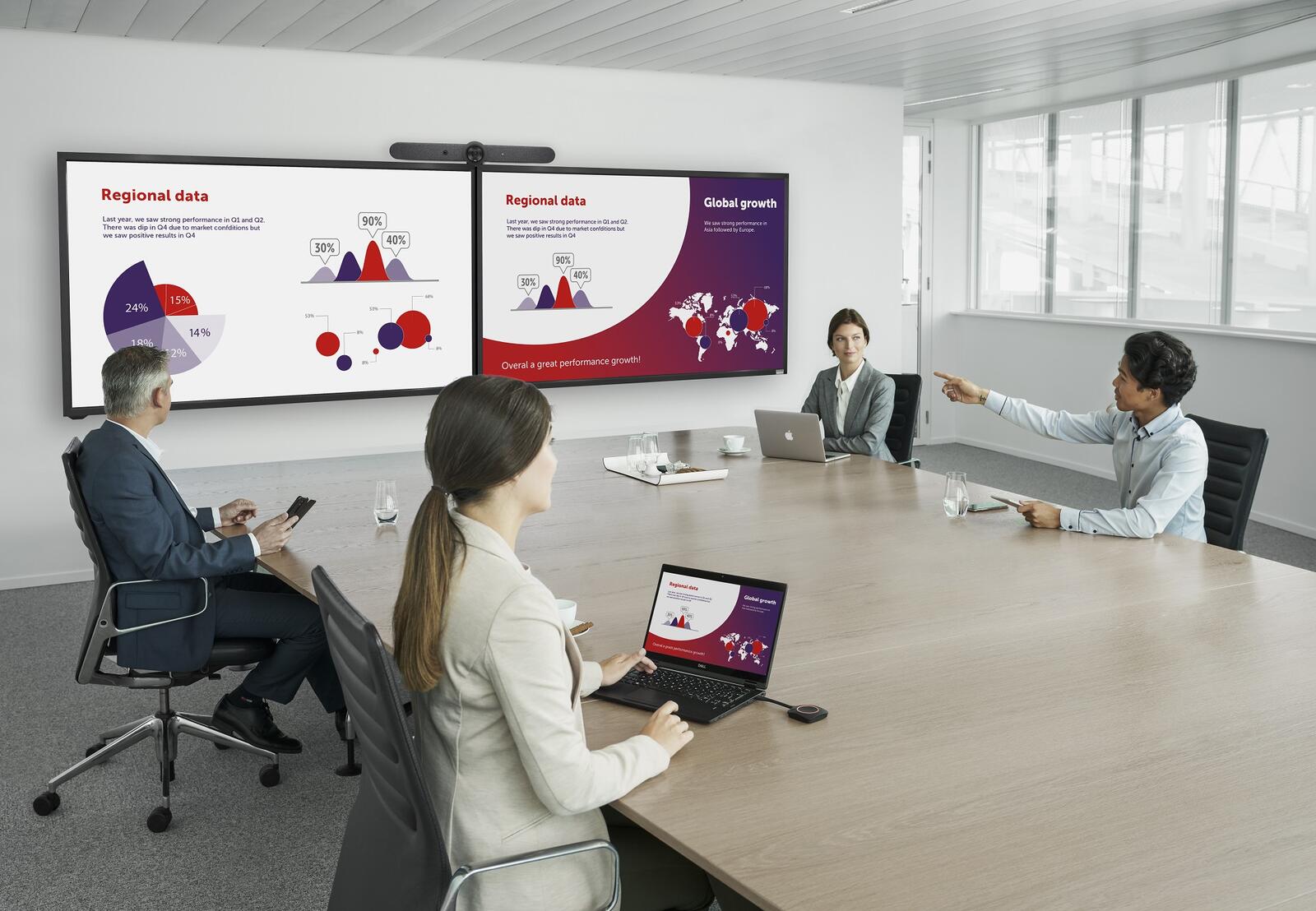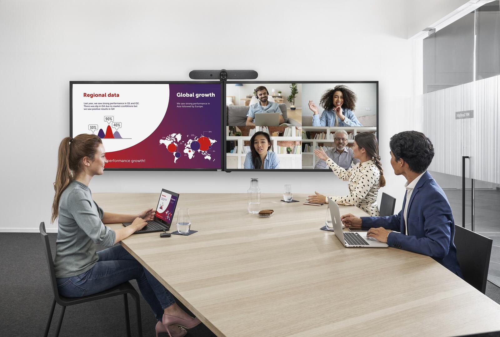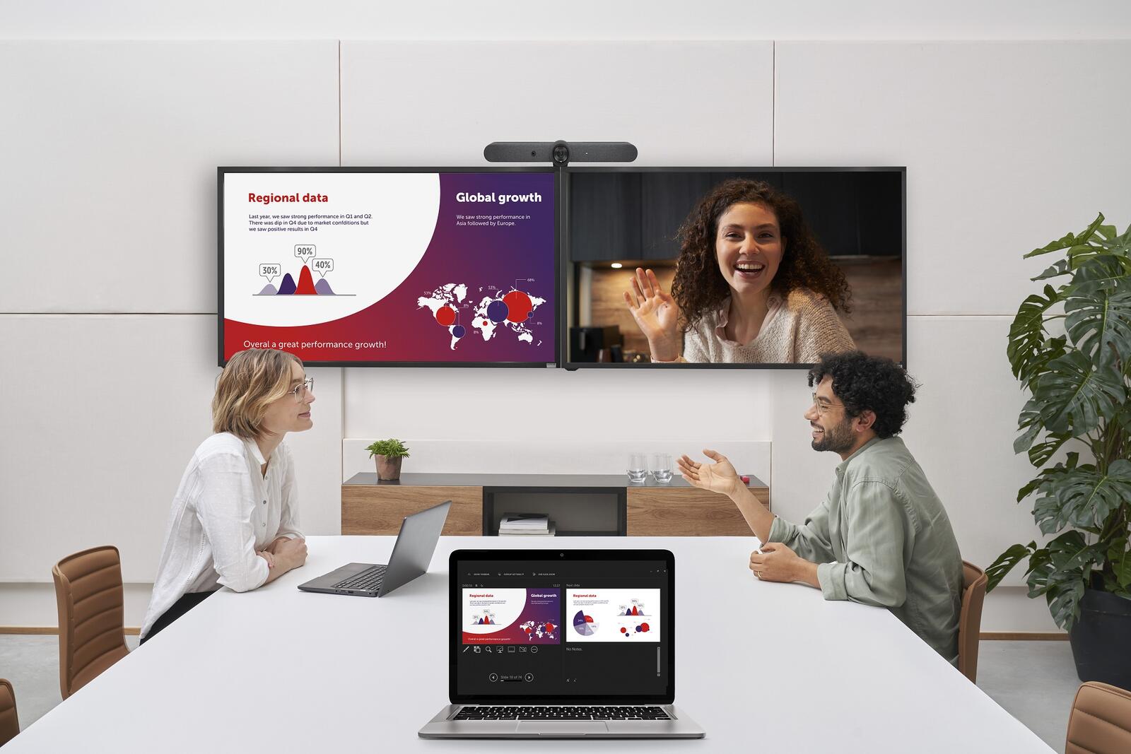 Profitieren Sie vom Support für 2 Bildschirme: Inhalte und Personen werden auf 2 Raumdisplays nebeneinander gezeigt. Sie können Teilnehmende, die sich aus der Ferne zuschalten, während der gesamten Videokonferenz sehens. Das sorgt für ein gleichberechtigteres Erlebnis für alle Teilnehmenden des Meetings – ganz gleich, ob sie sich aus der Ferne zuschalten oder im Raum sitzen. Profitieren Sie von Interaktivitätsfunktionen wie der lokalen Ansicht des Raumdisplays, Anmerkungen, Blackboarding und Touchback-Unterstützung.