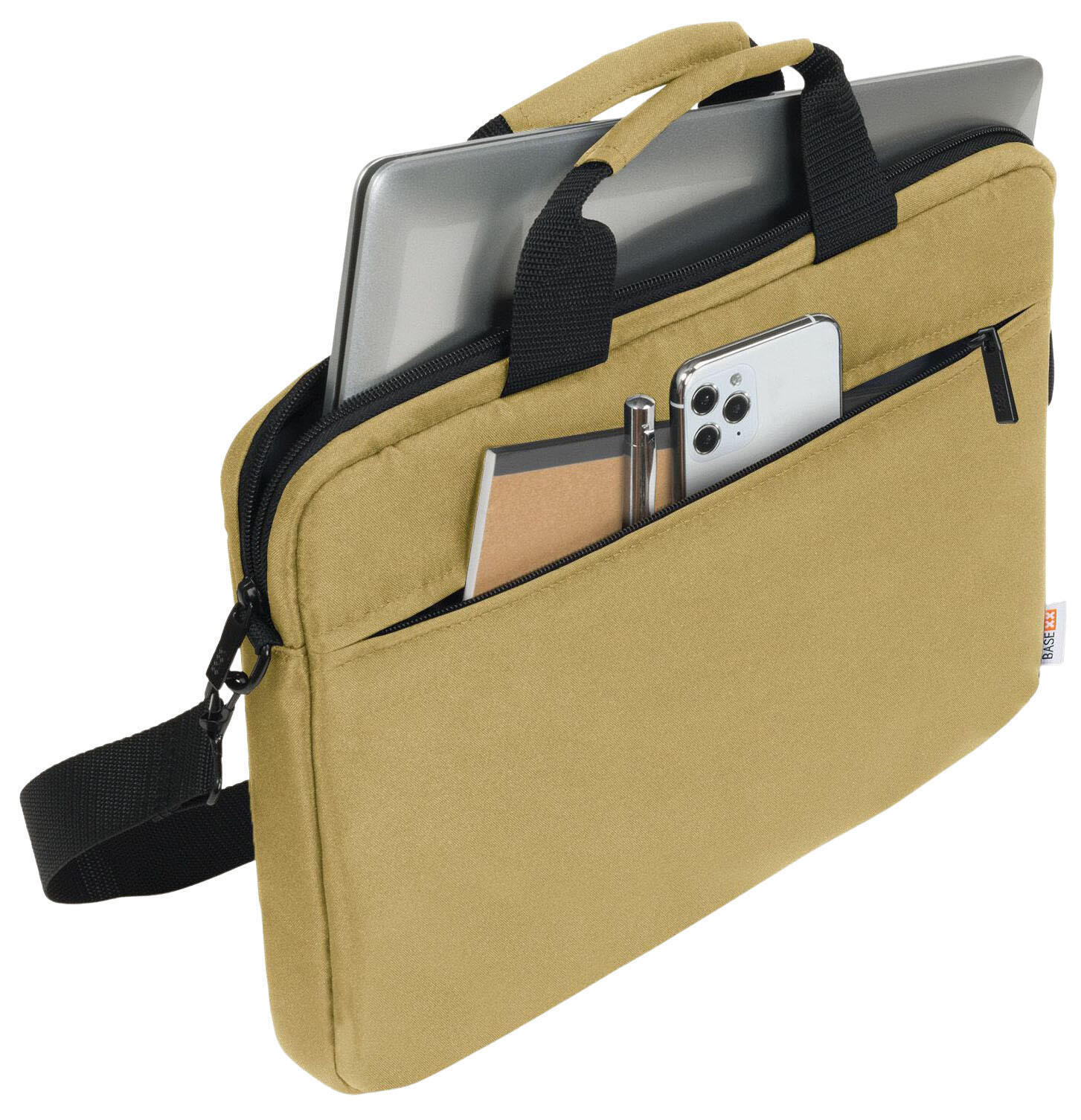 Die BASE XX Laptoptasche Slim in elegantem camel braun ist die ideale Begleiterin für alle, die ihren Laptop stilvoll und sicher transportieren möchten. Diese Tasche ist speziell für Notebooks bis zu einer Größe von 39,6 cm (15,6 Zoll) konzipiert und bietet somit den perfekten Schutz für dein Gerät. Die Rundum Polsterung sorgt für zusätzlichen Schutz und Sicherheit, sodass du dir keine Sorgen um Kratzer oder Stöße machen musst. Das gepolsterte Notebookfach ist optimal auf die Bedürfnisse von Technikliebhabern abgestimmt und bietet eine passgenaue Aufbewahrung für dein Gerät. Darüber hinaus verfügt die Tasche über eine praktische Fronttasche mit einer integrierten Workstation für mobiles Zubehör. Hier kannst du alles Wichtige, wie Ladegeräte, Kabel oder Notizen, ordentlich verstauen und hast es immer griffbereit. Hergestellt aus strapazierfähigem Polyester, ist die BASE XX Laptoptasche nicht nur robust, sondern auch leicht zu reinigen. Mit Außenmaßen von 40,0 x 4,0 x 28,0 cm ist sie kompakt und dennoch geräumig genug, um all deine Essentials zu beherbergen. Der klassische Farbton camel braun verleiht der Tasche eine zeitlose Eleganz, die sich sowohl im beruflichen als auch im privaten Umfeld sehen lassen kann. Die BASE XX Laptoptasche Slim ist die perfekte Lösung für alle, die Wert auf Funktionalität und Stil legen. Mit durchdachten Details und einem ansprechenden Design ist sie der ideale Schutz für dein Notebook und bietet gleichzeitig ausreichend Platz für dein Zubehör.Technische Daten