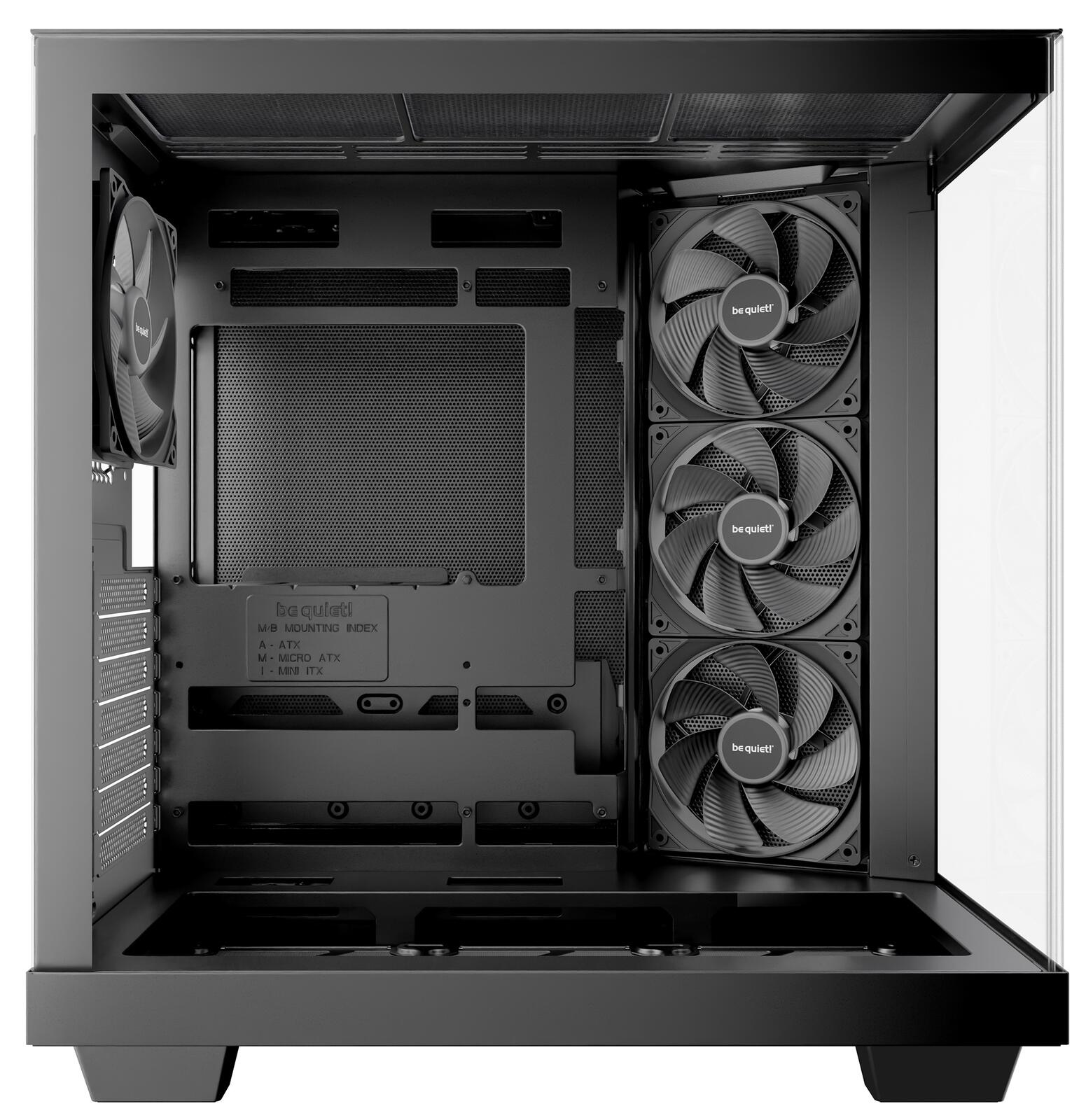 Light Base 500 verfügt über 4 vorinstallierte Pure Wings 3-Lüfter. Der hintere Lüfter ist ein Pure Wings 3 120mm PWM, die Ansauglüfter an der Seite sind Pure Wings 3 120mm PWM-Lüfter mit umgekehrten Lüfterblättern. Alle Lüfter sind für einen maximalen Airflow optimiert und reduzieren mit ihren speziell geformten Lüfterblättern gleichzeitig die Geräuschentwicklung und die Turbulenzen. Die umgekehrten Lüfterblätter sorgen dafür, dass ihre schöne Seite jederzeit sichtbar ist.