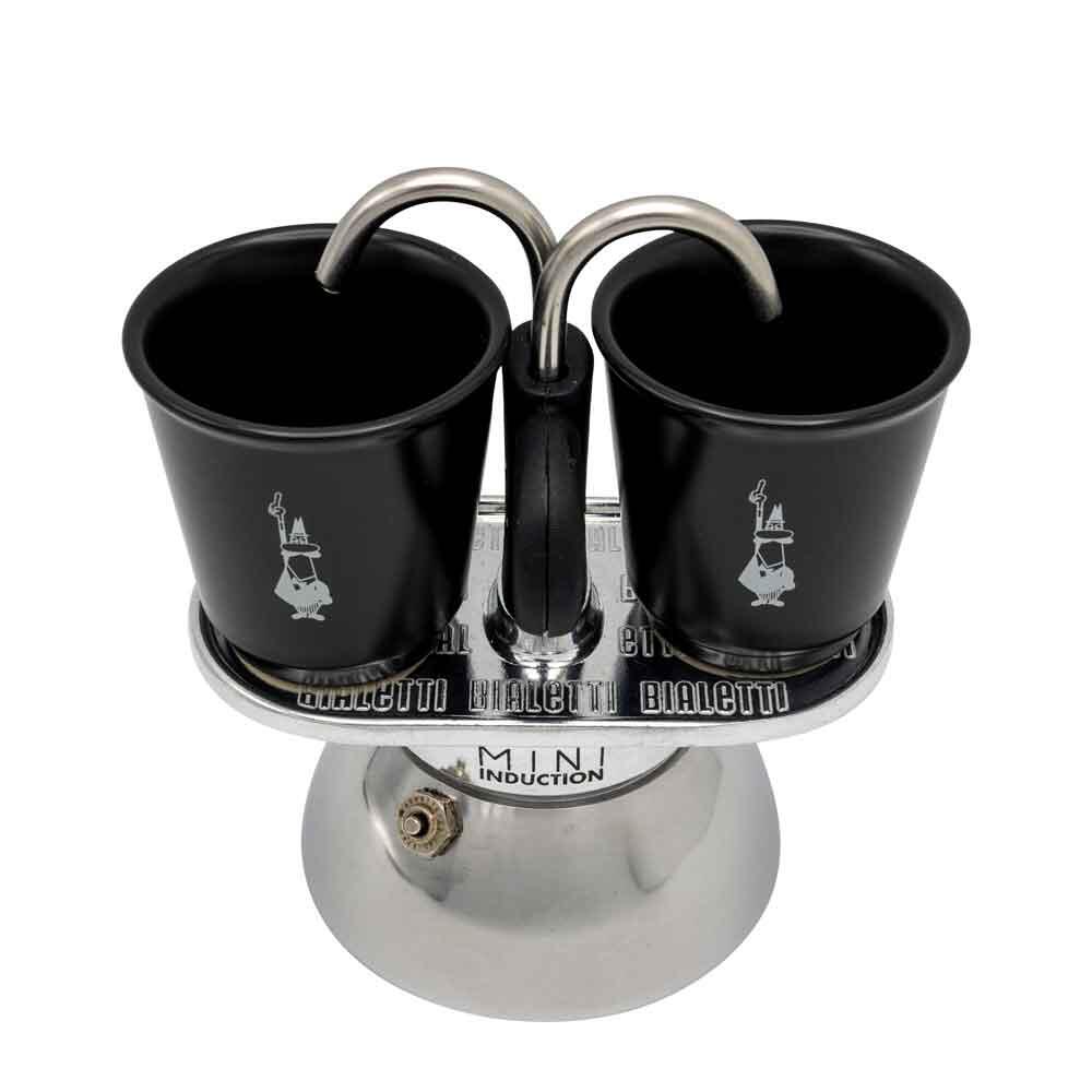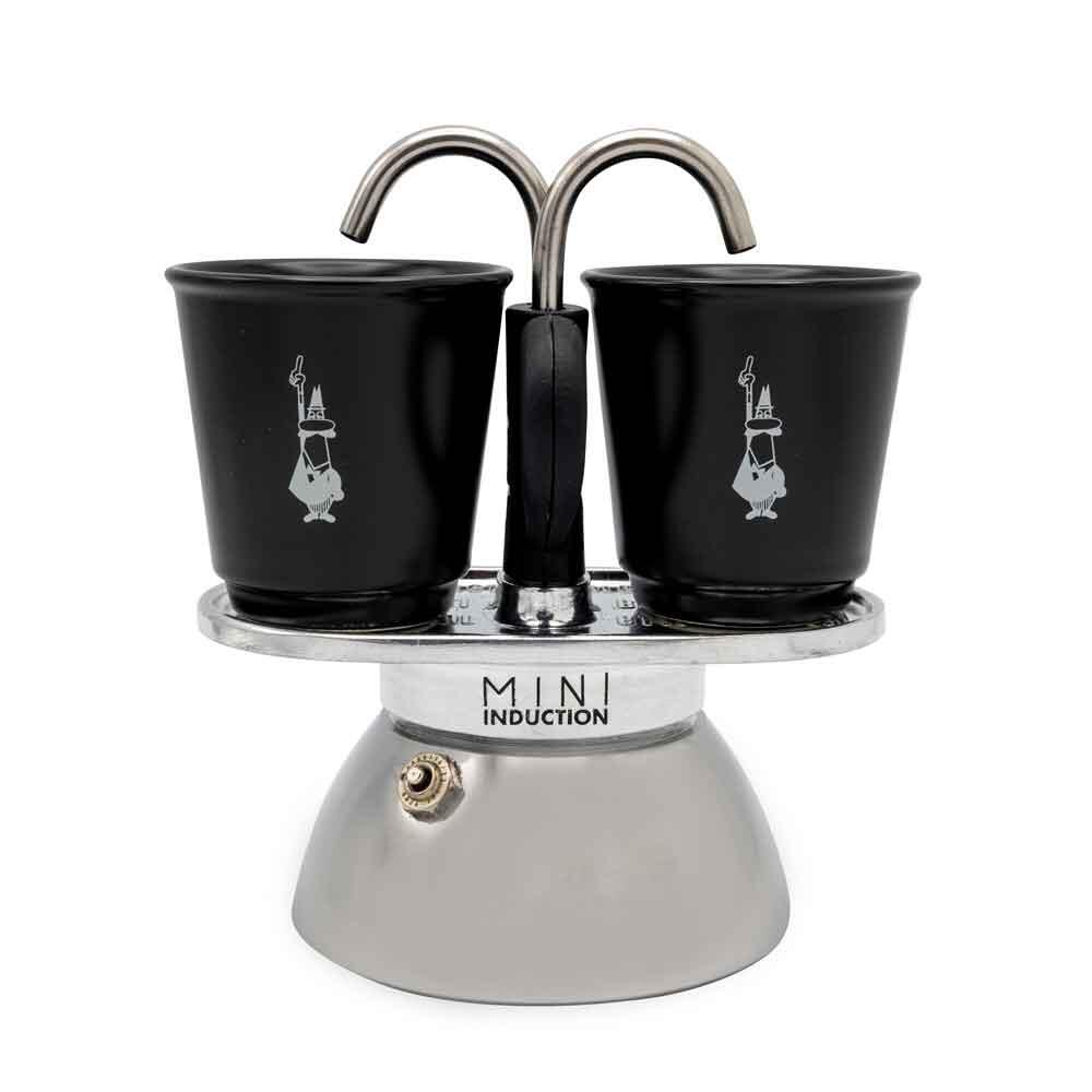 Bialetti Mini Express - Espressokocher-Set (Induktion) silber + 2 Becher in schwarz