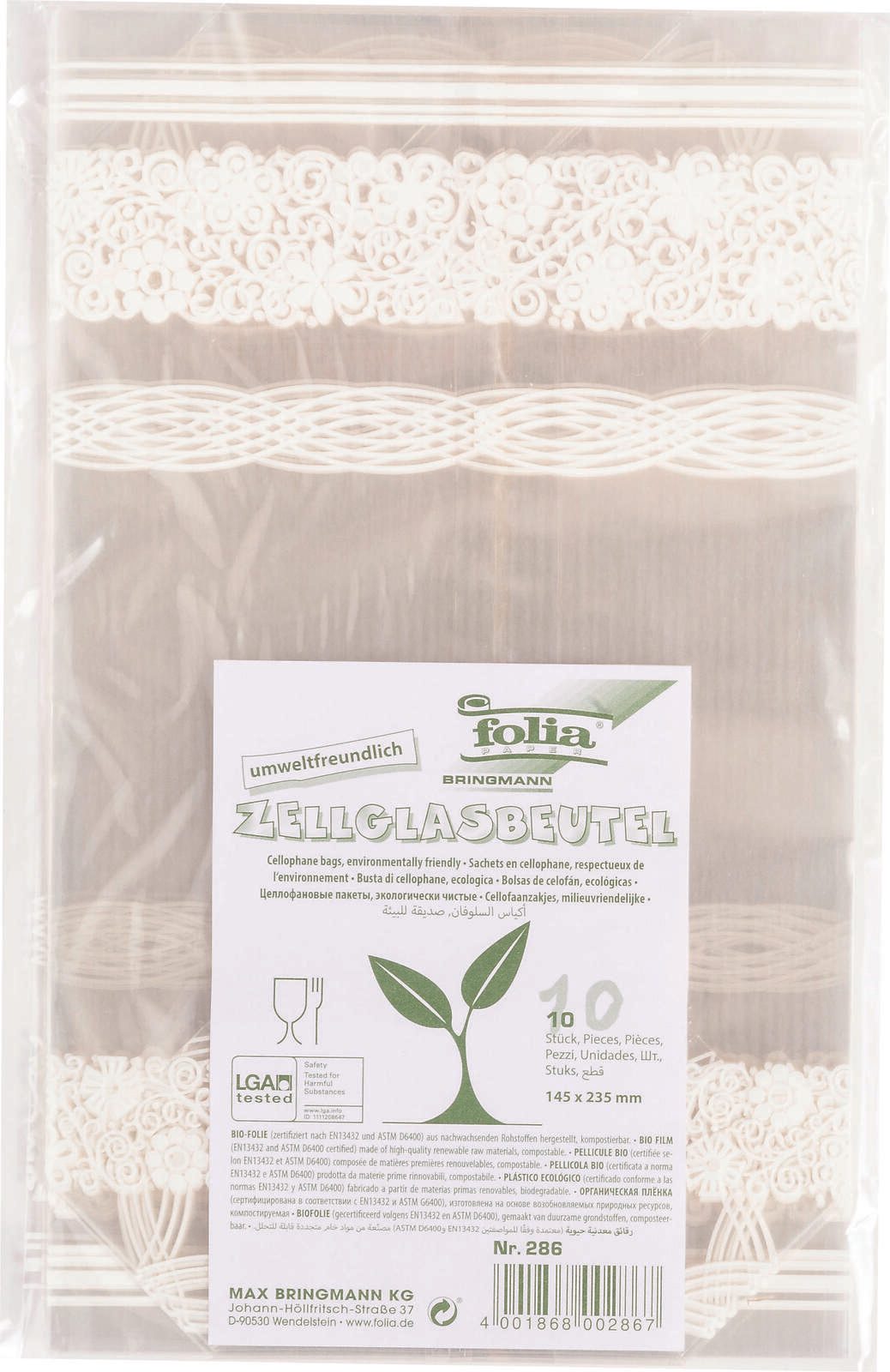 Die folia Zellglasbeutel in der Größe 14,5 x 23,5 cm sind die ideale Lösung für all deine Verpackungsbedürfnisse. Diese transparenten Beutel bestehen aus hochwertigem Zellglas, das nicht nur eine ansprechende Optik bietet, sondern auch lebensmittelecht ist. Damit sind sie perfekt geeignet, um Lebensmittel sicher und hygienisch aufzubewahren. Egal, ob du Süßigkeiten, Backwaren oder andere Delikatessen verpacken möchtest, diese Beutel garantieren Frische und Schutz. Mit einem praktischen Maß von 14,5 cm in der Breite und 23,5 cm in der Höhe bieten die Zellglasbeutel ausreichend Platz für eine Vielzahl von Inhalten. Der weiße Spitzendruck verleiht den Beuteln eine elegante Note und macht sie zu einer ansprechenden Wahl für Geschenke oder besondere Anlässe. Die durchsichtige Materialbeschaffenheit ermöglicht es, den Inhalt auf einen Blick zu erkennen, was besonders praktisch ist, wenn du mehrere Beutel aufbewahrst. In einer Packung sind 10 Stück enthalten, was sie zu einer wirtschaftlichen Wahl für regelmäßige Verpackungsbedarfe macht. Die Verwendung von Zellglas als Material sorgt dafür, dass die Beutel nicht nur umweltfreundlich, sondern auch robust und langlebig sind. Du kannst sicher sein, dass deine Lebensmittel optimal geschützt sind und gleichzeitig ansprechend präsentiert werden. Die folia Zellglasbeutel sind nicht nur praktisch, sondern auch vielseitig einsetzbar. Ob für den privaten Gebrauch oder für gewerbliche Zwecke, sie sind eine hervorragende Wahl für alle, die Wert auf Qualität und ansprechendes Design legen. Mit diesen Beuteln bringst du Ordnung in deine Verpackungen und setzt gleichzeitig auf eine ansprechende Präsentation.Technische Daten