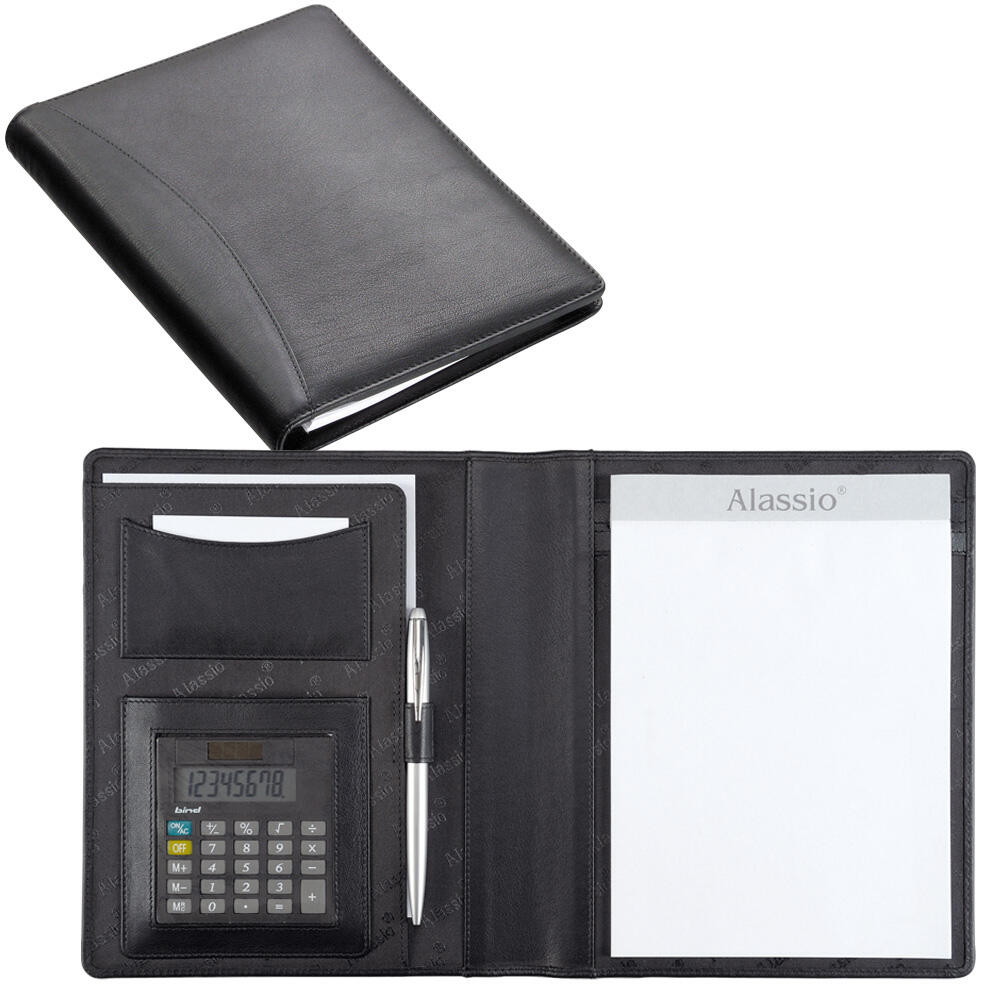 Die Alassio Konferenzmappe BORMIO I in elegantem Schwarz ist die perfekte Lösung für alle, die Wert auf Stil und Funktionalität legen. Diese hochwertige Konferenzmappe aus Lederimitat bietet nicht nur einen ansprechenden Look, sondern auch praktische Eigenschaften, die dir bei deinen Meetings und Präsentationen helfen. Mit einem speziellen Stiftehalter ausgestattet, hast du immer einen Schreibstift griffbereit, um wichtige Notizen festzuhalten oder spontane Ideen zu skizzieren. Zudem verfügt die Mappe über einen Taschenrechnerhalter, sodass du auch unterwegs schnell Berechnungen anstellen kannst. Ein integrierter Schreibblock sorgt dafür, dass du jederzeit bereit bist, deine Gedanken zu Papier zu bringen. Die BORMIO I Konferenzmappe ist für das A5-Format konzipiert und bietet ausreichend Platz für Dokumente, Notizen und weitere Unterlagen. Die Ringmechanik ist nicht vorhanden, was die Mappe besonders schlank und leicht macht. Mit einer Stifteschlaufe ausgestattet, bleibt dein Schreibgerät sicher an seinem Platz und ist sofort einsatzbereit. Ob im Büro, bei Konferenzen oder im Studium, die Alassio Konferenzmappe BORMIO I kombiniert Funktionalität mit einem zeitlosen Design. Sie ist nicht nur ein praktisches Hilfsmittel, sondern auch ein stilvolles Accessoire, das deinen professionellen Auftritt unterstreicht. Vertraue auf die Qualität von Alassio und erlebe, wie diese Konferenzmappe deinem Arbeitsalltag eine neue Note verleiht.Technische Daten