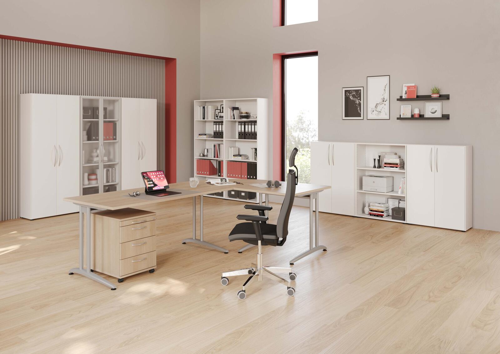 Der HAMMERBACHER Schreibtisch VBS82/E/S in Eiche ist die perfekte Wahl für Ihr Home Office oder Ihr Arbeitszimmer. Mit seiner eleganten L-Form und dem ansprechenden Design fügt sich dieser Schreibtisch harmonisch in jede Umgebung ein und bietet Ihnen einen stilvollen Arbeitsplatz. Die Tischplatte aus robuster Spanplatte sorgt für eine langlebige Nutzung, während das silberne C-Fuß-Gestell aus Stahl nicht nur Stabilität, sondern auch eine moderne Ästhetik bietet.