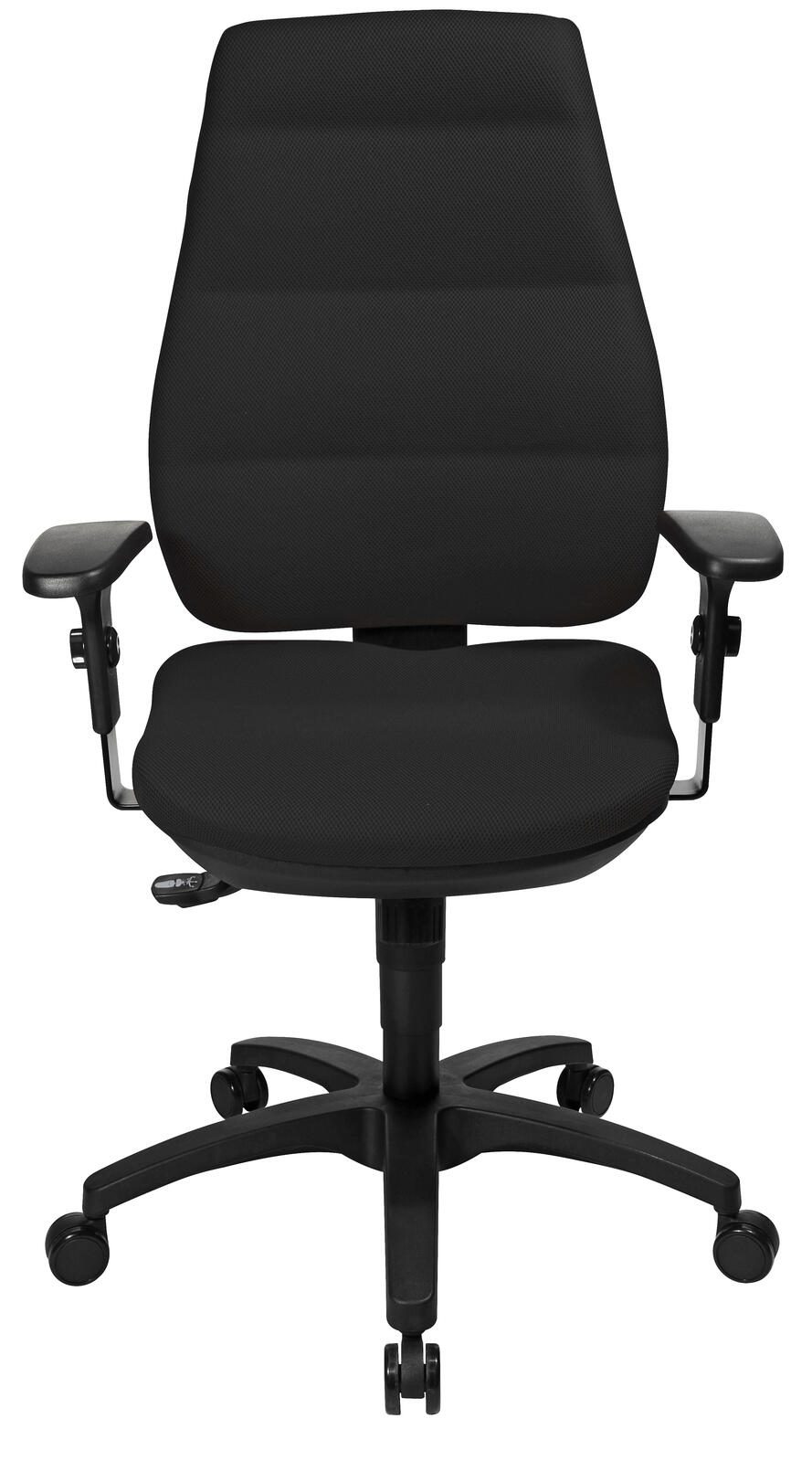 Die Rückenlehne ist gepolstert und bietet eine hohe Scheuerfestigkeit von 20.000 Scheuertouren. Die Rückenlehne ist in der Neigung verstellbar und auch in der Höhe anpassbar, was zusätzlichen Komfort verspricht. Der Bandscheibensitz fördert eine gesunde Sitzhaltung und ist insbesondere für Personen mit einer Größe von bis zu 192,0 cm geeignet.