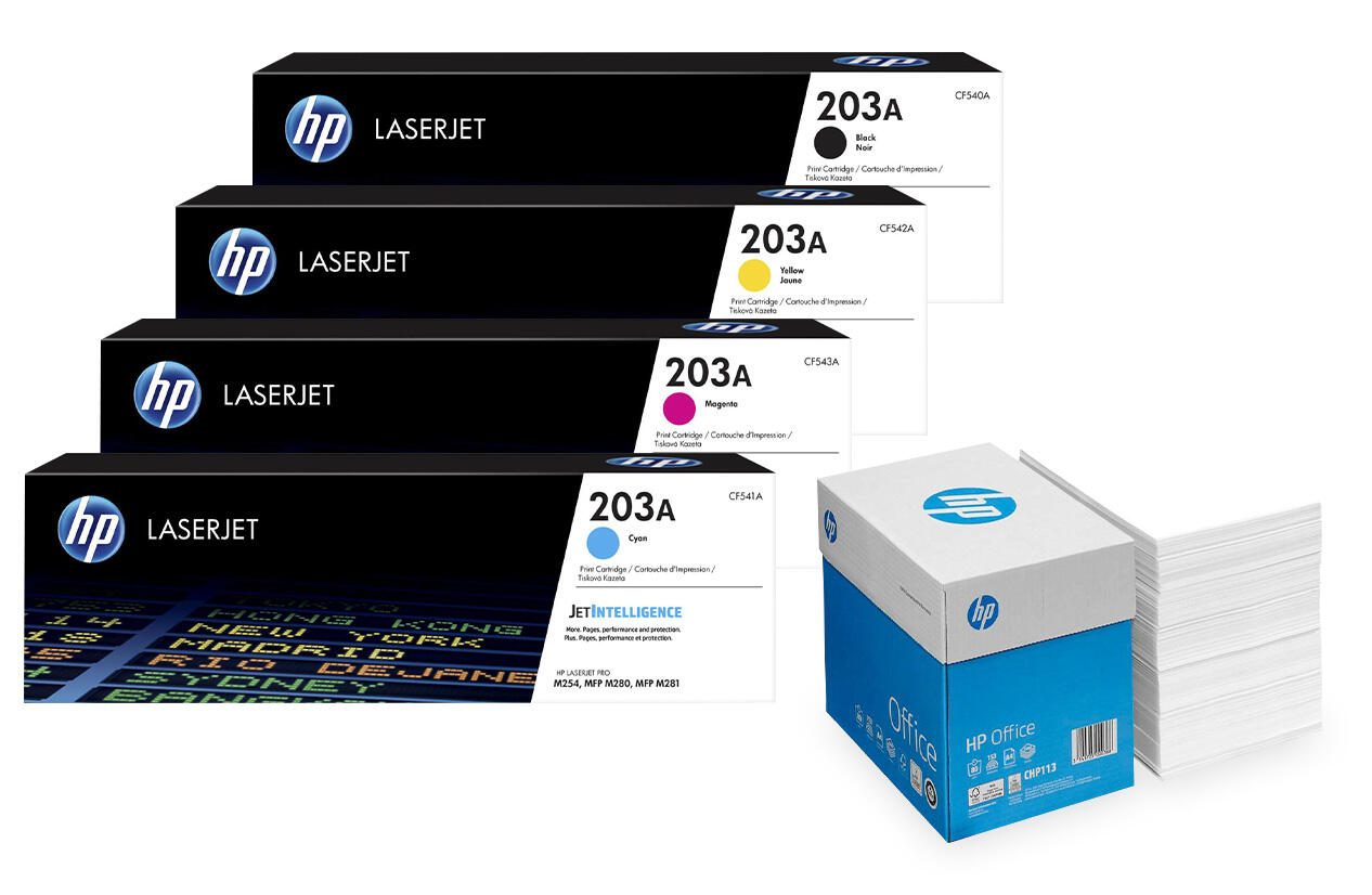 Bundle mit HP Original 203A Toner 4er Multipack + 2.500 Blatt HP Kopierpapier hochweiß