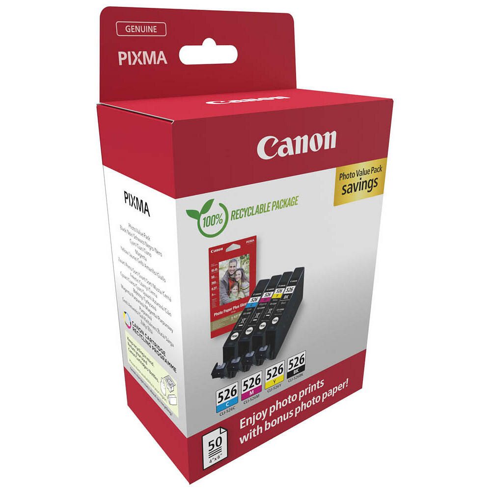 Canon Original CLI-526 Druckerpatronen Value Pack - 1 x schwarz / je 1 x CMY + 50 Blatt Fotopapier (4540B019)