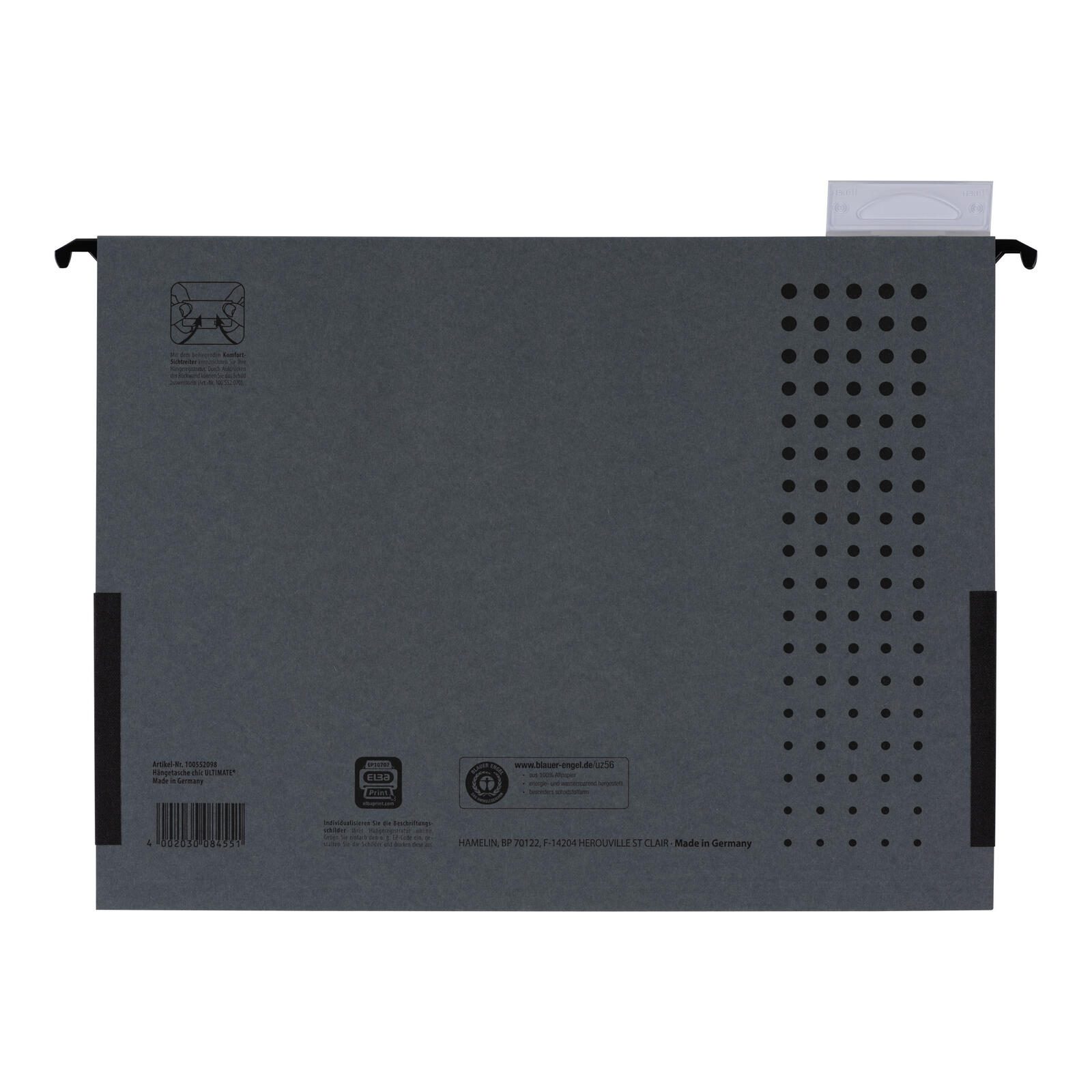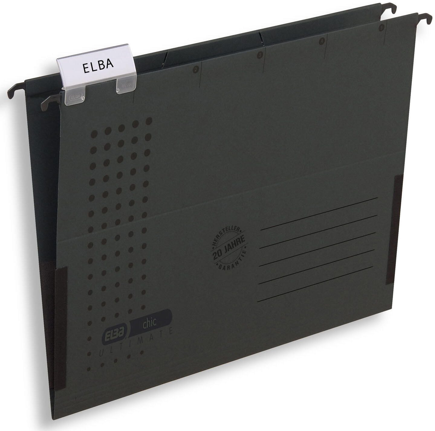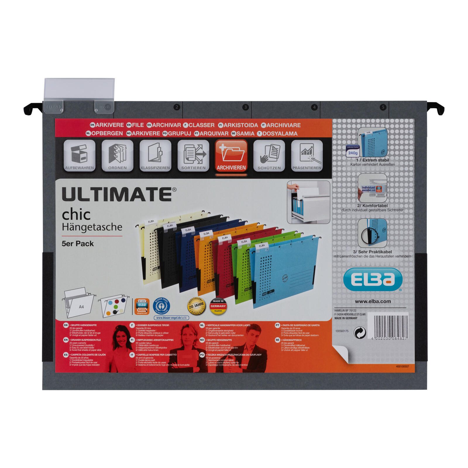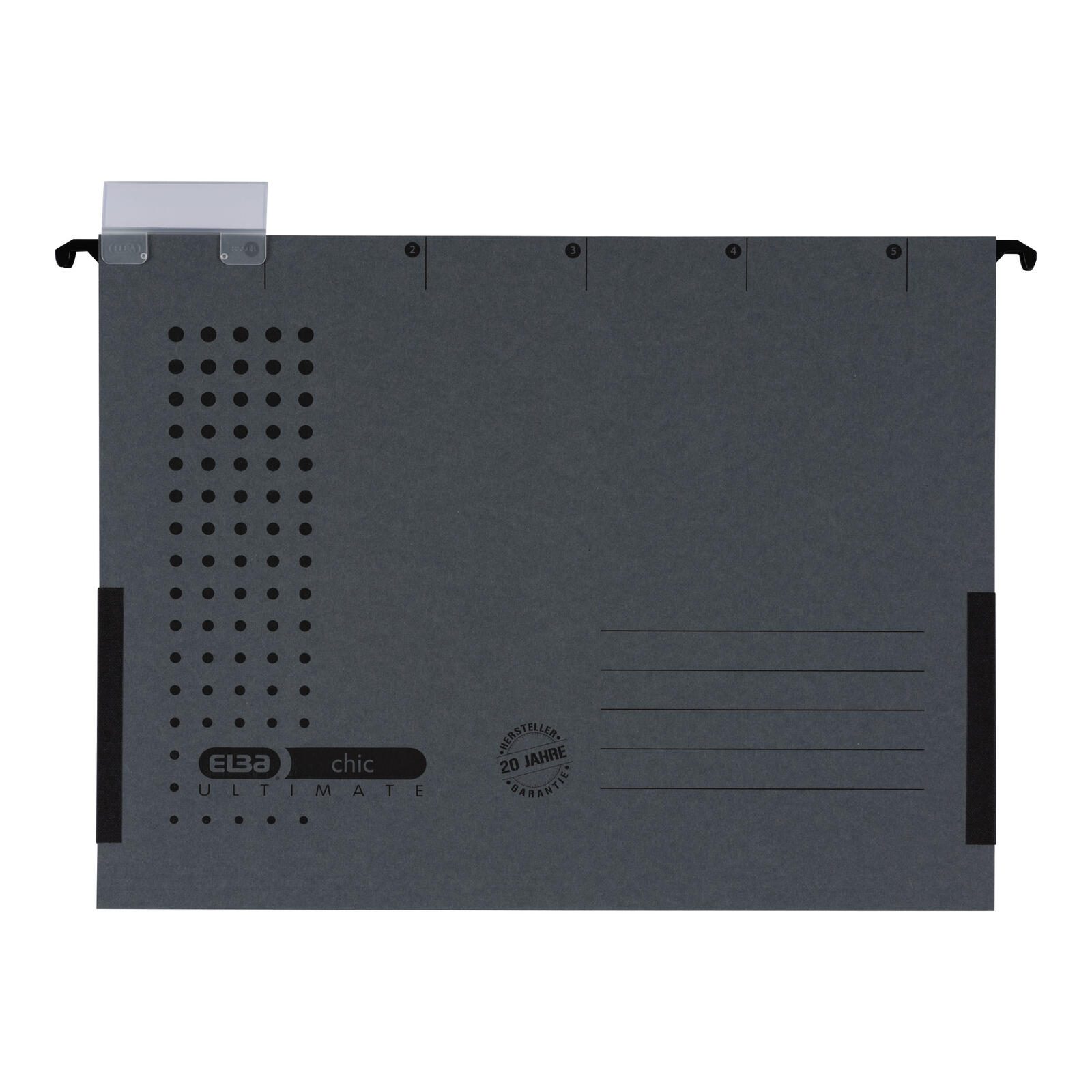 Die ELBA Hängetaschen Chic Ultimate in der eleganten Farbe anthrazit sind die perfekte Lösung für die organisierte Aufbewahrung von Dokumenten im Format DIN A4. Diese hochwertigen Hängetaschen bestehen aus robustem Karton mit einem Papiergewicht von 240 g/m², was ihnen eine hervorragende Stabilität und Langlebigkeit verleiht. Mit diesen Hängetaschen kannst du deine Unterlagen sicher und ordentlich sortieren. Sie sind ideal für die lose Ablage von Dokumenten und bieten ausreichend Platz für wichtige Papiere, Berichte oder Präsentationen. Die anthrazitfarbene Ausführung verleiht deinem Büro oder Arbeitsbereich eine moderne und stilvolle Note. Die Lieferung umfasst fünf Hängetaschen, die mit verschieb- und einrastbaren Vollsichtreitern sowie Beschriftungsschildchen ausgestattet sind. Diese praktischen Features ermöglichen es dir, die Inhalte der Taschen schnell zu identifizieren und bei Bedarf leicht zu reorganisieren. So behältst du immer den Überblick über deine Unterlagen und kannst effizient arbeiten. Die ELBA Hängetaschen Chic Ultimate sind nicht nur funktional, sondern auch ästhetisch ansprechend, was sie zu einer idealen Wahl für jeden Arbeitsplatz macht. Egal, ob im Büro, im Homeoffice oder in der Schule, diese Hängetaschen bieten eine stilvolle und praktische Lösung für deine Ablagebedürfnisse.Technische Daten