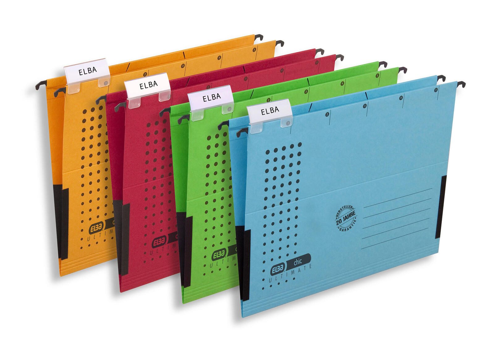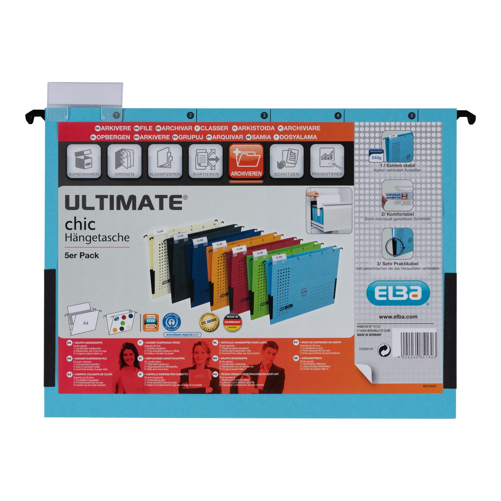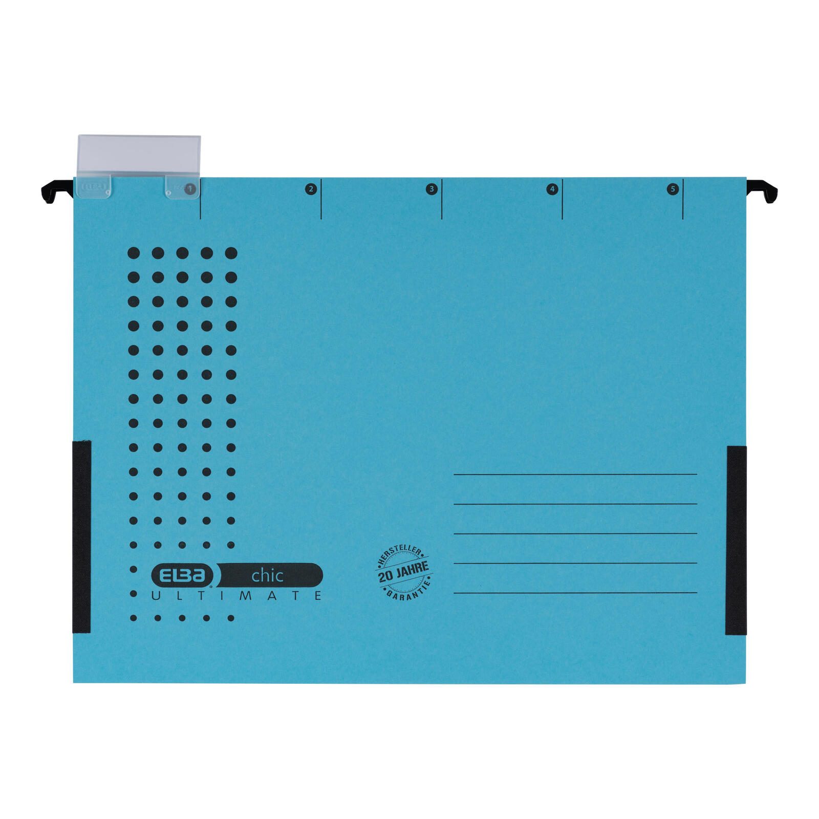 Die ELBA Hängetaschen Chic Ultimate in einem eleganten Blau sind die perfekte Lösung für die ordentliche und stilvolle Aufbewahrung von Dokumenten im DIN A4 Format. Diese hochwertigen Hängetaschen bestehen aus robustem Karton mit einem Papiergewicht von 240 g/m², was ihnen eine ausgezeichnete Stabilität verleiht. Du kannst dich darauf verlassen, dass deine Unterlagen sicher und geschützt aufbewahrt werden. Mit einem Pack von fünf Hängetaschen erhältst du nicht nur eine praktische Aufbewahrungslösung, sondern auch eine ansprechende Optik für dein Büro oder Zuhause. Die chic ULTIMATE Serie von ELBA kombiniert Funktionalität mit einem modernen Design, das in jedem Umfeld gut aussieht. Die Hängetaschen sind ideal für die lose Ablage von Dokumenten und ermöglichen dir eine einfache Organisation deiner Unterlagen. Ein besonderes Highlight sind die im Lieferumfang enthaltenen verschieb- und einrastbaren Vollsichtreiter sowie die Beschriftungsschildchen. Diese Features erleichtern dir das Sortieren und Kennzeichnen deiner Dokumente, sodass du jederzeit den Überblick behältst. Egal, ob du wichtige Unterlagen für die Arbeit, Schule oder persönliche Projekte aufbewahren möchtest, die ELBA Hängetaschen bieten dir die Flexibilität, die du benötigst. Die elegante blaue Farbe verleiht deinem Arbeitsplatz eine frische Note und sorgt dafür, dass deine Dokumente nicht nur funktional, sondern auch ästhetisch ansprechend präsentiert werden. Mit den ELBA Hängetaschen Chic Ultimate kannst du deine Unterlagen stilvoll organisieren und aufbewahren.Technische Daten