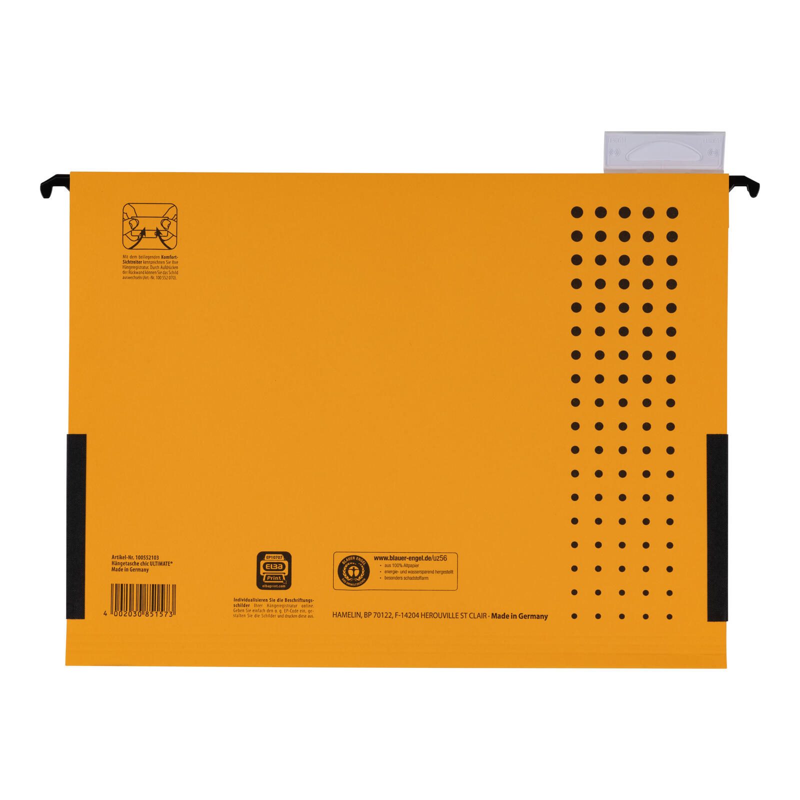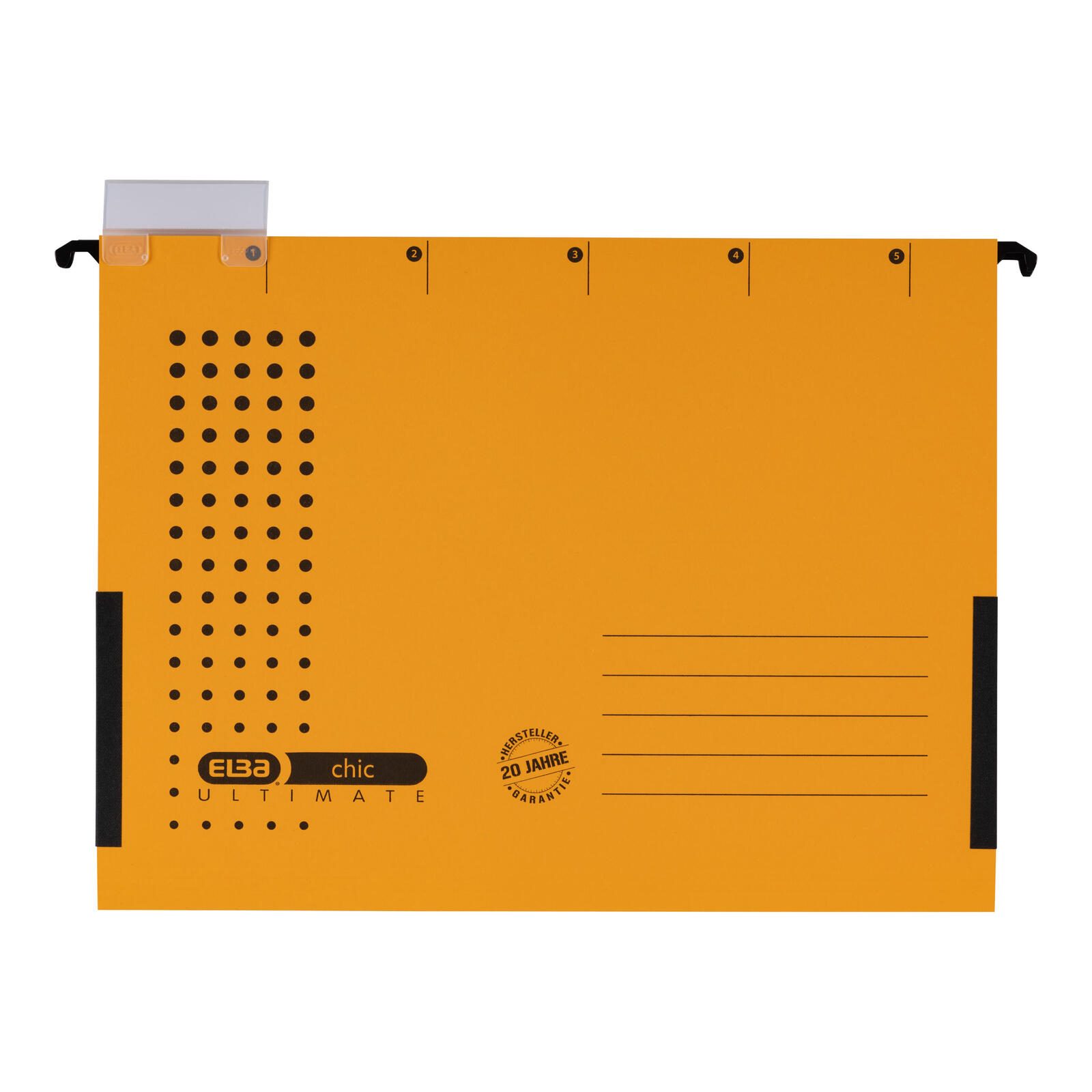 Die ELBA Hängetaschen Chic Ultimate in einem strahlenden Gelb sind die perfekte Lösung für die ordentliche und stilvolle Ablage deiner Unterlagen im DIN A4 Format. Mit einem Papiergewicht von 240 g/m² bieten diese Taschen nicht nur eine ansprechende Optik, sondern auch eine hohe Stabilität und Langlebigkeit. Das verwendete Material, hochwertiger Karton, sorgt dafür, dass deine Dokumente sicher und geschützt aufbewahrt werden. Ein besonderes Highlight der ELBA Hängetaschen ist die Lieferung, die bereits verschieb- und einrastbare Vollsichtreiter sowie praktische Beschriftungsschildchen beinhaltet. So kannst du deine Unterlagen ganz einfach kategorisieren und schnell wiederfinden, ohne Zeit mit Suchen zu verlieren. Das ansprechende Design der Serie Chic Ultimate vereint Funktionalität mit einem modernen Look, der in jedem Büro oder Homeoffice zum Hingucker wird. Mit einem Packungsinhalt von 5 Stück bist du bestens ausgestattet, um deine Dokumente effizient zu organisieren. Die leuchtende Farbgebung in Gelb bringt nicht nur Frische in deinen Arbeitsplatz, sondern hebt auch die Stimmung und fördert die Kreativität. Egal, ob du wichtige Verträge, Präsentationen oder persönliche Unterlagen aufbewahren möchtest, diese Hängetaschen bieten dir die ideale Lösung zur losen Ablage. Die ELBA Hängetaschen Chic Ultimate sind nicht nur praktisch, sondern auch ein stilvolles Accessoire für dein Büro. Vertraue auf die Qualität von ELBA und erlebe, wie einfach und effektiv die Organisation deiner Unterlagen sein kann.Technische Daten
