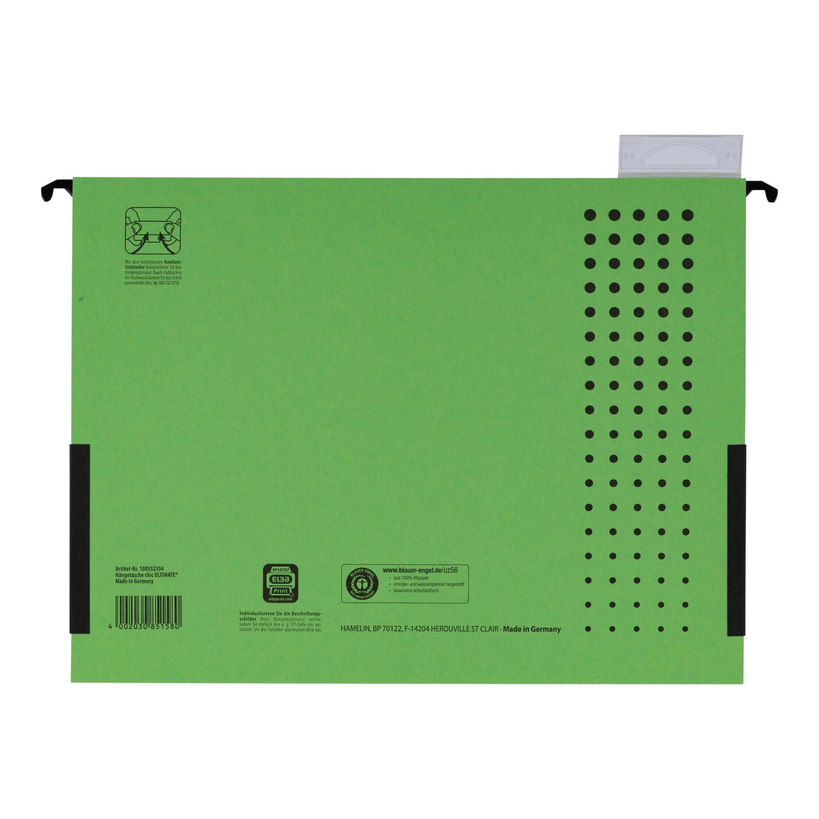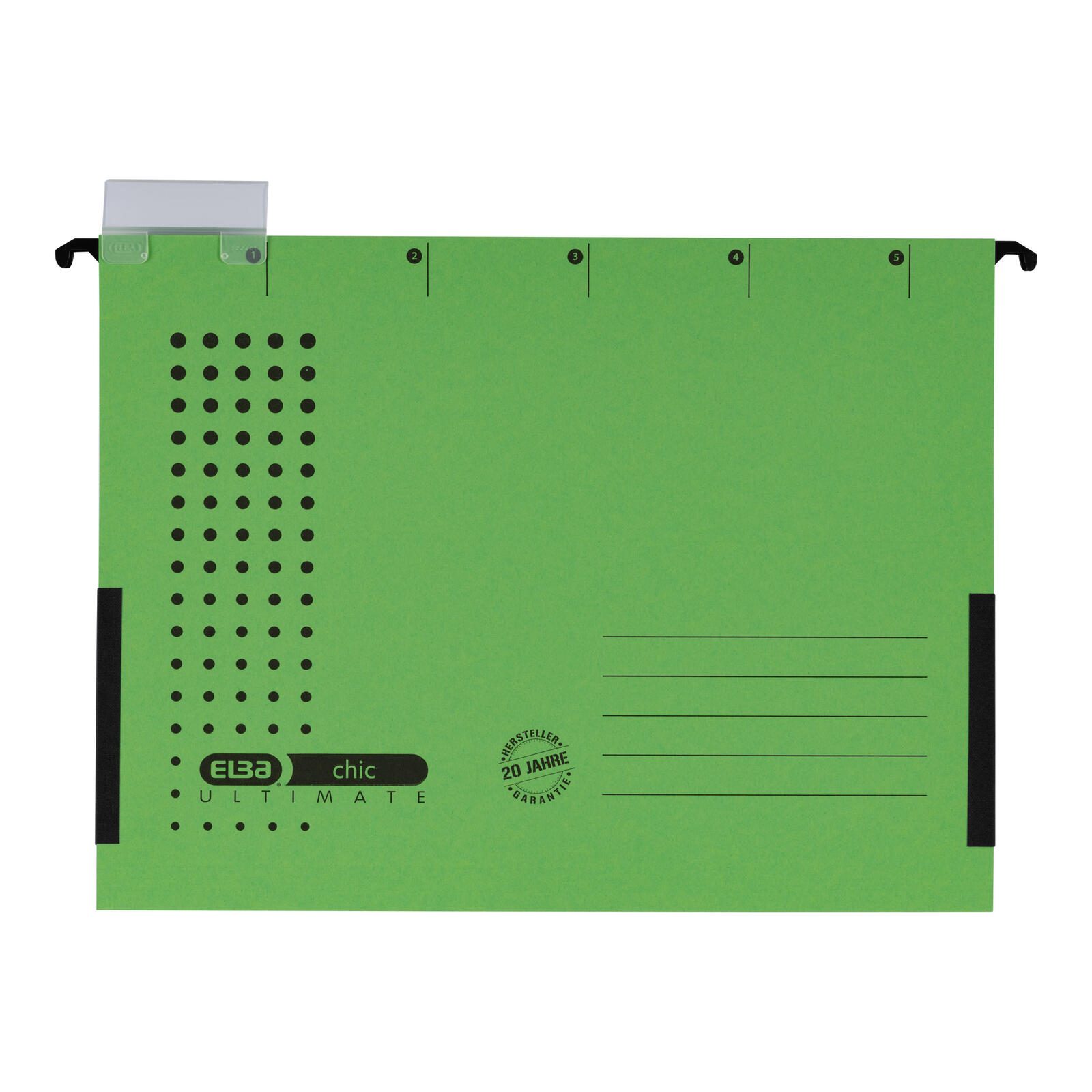 Die ELBA Hängetaschen Chic Ultimate in einem ansprechenden Grünton sind die perfekte Lösung für die geordnete und stilvolle Aufbewahrung deiner Dokumente im DIN A4 Format. Hergestellt aus hochwertigem Karton mit einem Papiergewicht von 240 g/m², bieten diese Taschen nicht nur Stabilität, sondern auch eine ansprechende Optik, die in jedem Büro oder Homeoffice glänzt. Die Hängetaschen sind speziell für die lose Ablage konzipiert und ermöglichen es dir, deine Unterlagen übersichtlich und sicher zu organisieren. Mit der Lieferung von fünf Taschen pro Packung hast du ausreichend Platz, um deine wichtigsten Dokumente zu sortieren und jederzeit griffbereit zu haben. Die praktischen, verschieb- und einrastbaren Vollsichtreiter sowie die Beschriftungsschildchen machen es dir leicht, den Inhalt jeder Tasche schnell zu identifizieren und zu verwalten. Die grüne Farbe der Hängetaschen bringt nicht nur einen frischen Akzent in deinen Arbeitsplatz, sondern sorgt auch dafür, dass deine Unterlagen nicht in der Masse untergehen. Die Serie Chic Ultimate von ELBA verbindet Funktionalität mit einem modernen Design, das sowohl im beruflichen als auch im privaten Umfeld überzeugt. Entscheide dich für die ELBA Hängetaschen Chic Ultimate grün und erlebe, wie einfach und ansprechend die Organisation deiner Dokumente sein kann.Technische Daten