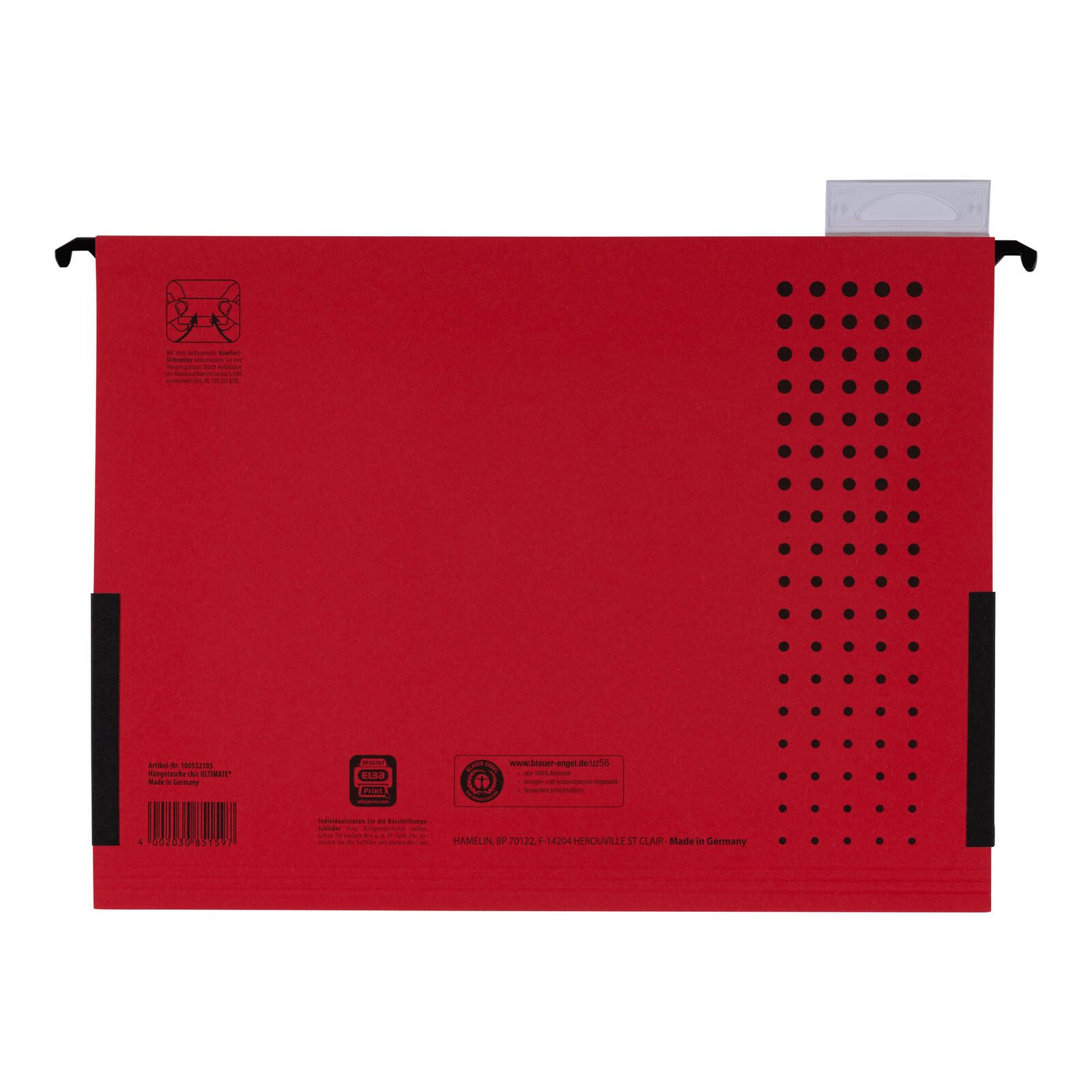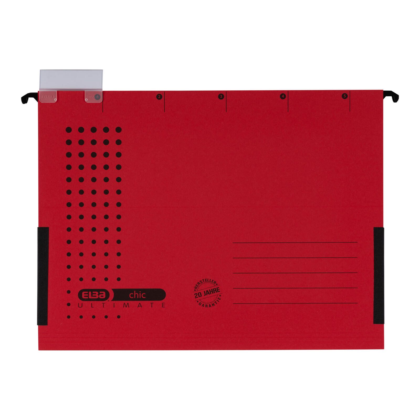 Die ELBA Hängetaschen Chic Ultimate in einem auffälligen Rot sind die perfekte Lösung für die organisierte Ablage deiner Dokumente im DIN A4 Format. Hergestellt aus hochwertigem Karton mit einem Papiergewicht von 240 g/m², bieten diese Taschen nicht nur eine ansprechende Optik, sondern auch eine robuste und langlebige Nutzung. Der kräftige Farbton sorgt dafür, dass deine Unterlagen nicht nur sicher aufbewahrt, sondern auch stilvoll präsentiert werden. Mit einem Pack von 5 Stück bist du bestens ausgestattet, um deine Unterlagen effizient zu sortieren. Die Lieferung umfasst verschieb- und einrastbare Vollsichtreiter sowie Beschriftungsschildchen, die dir helfen, deine Dokumente schnell und einfach zu kennzeichnen. So behältst du immer den Überblick und kannst wichtige Informationen auf einen Blick erkennen. Die ELBA Hängetaschen Chic Ultimate sind ideal für die lose Ablage von Dokumenten und bieten dir die Flexibilität, deine Unterlagen nach Bedarf zu organisieren. Ob im Büro, in der Schule oder zu Hause, diese Hängetaschen sind vielseitig einsetzbar und tragen dazu bei, deine Arbeitsumgebung ordentlich und strukturiert zu halten. Die Kombination aus Funktionalität und modernem Design macht die ELBA Hängetaschen zu einem unverzichtbaren Zubehör für jeden, der Wert auf eine ansprechende und effektive Dokumentenablage legt. Entscheide dich für die ELBA Hängetaschen Chic Ultimate in Rot und erlebe, wie einfach und stilvoll die Organisation deiner Unterlagen sein kann.Technische Daten