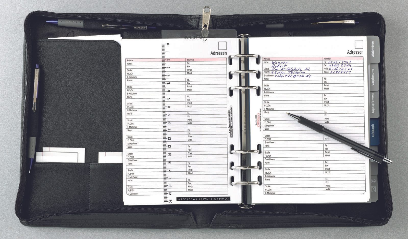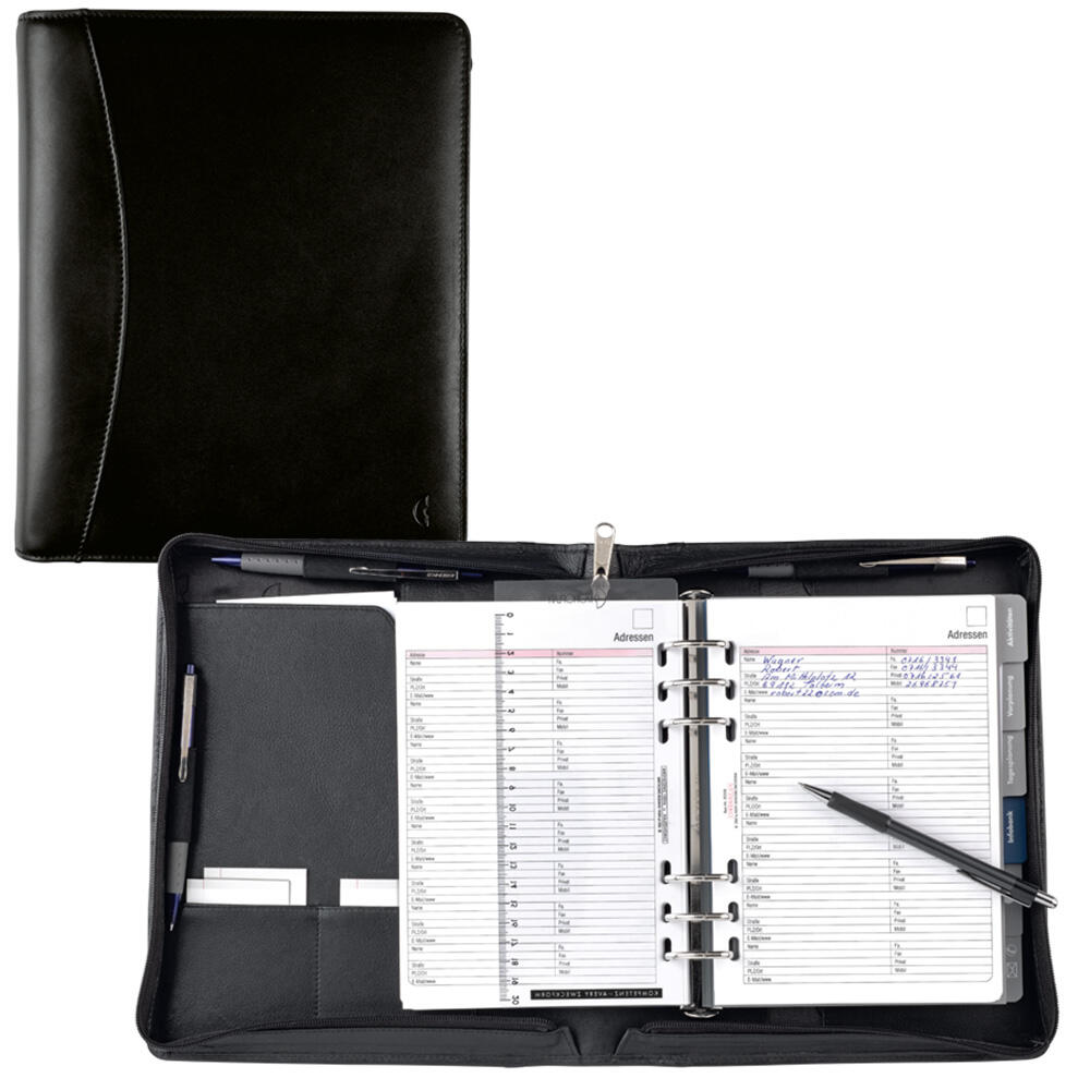 Im Lieferumfang enthalten sind ein Formularpaket, Register, Tagesanzeiger und sogar ein praktischer Druckbleistift. So hast du alles Nötige griffbereit, um deine Termine und Aufgaben optimal zu organisieren.