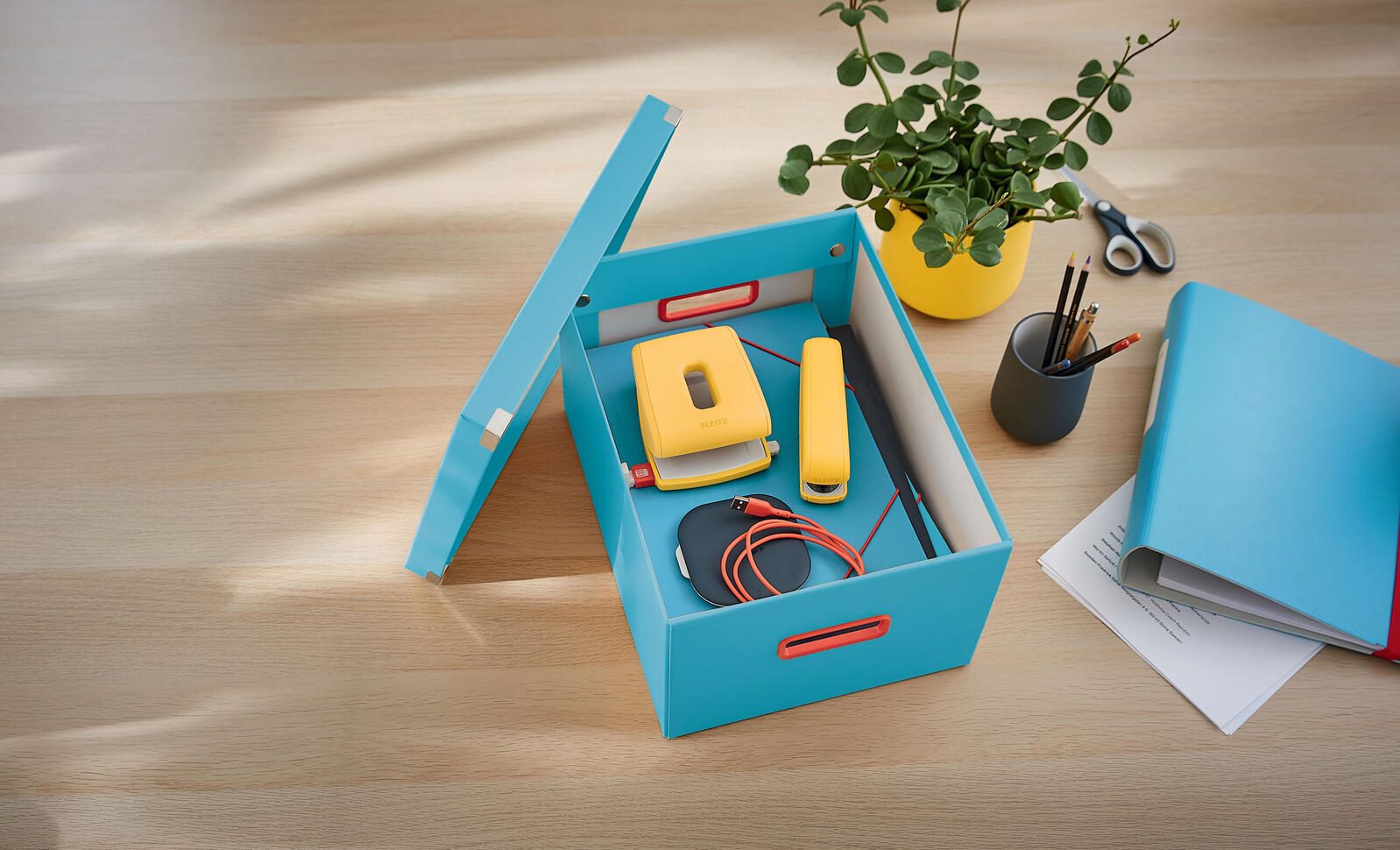 Die LEITZ Aufbewahrungsbox Click&Store in einem ansprechenden Blau ist die ideale Lösung für die organisierte Aufbewahrung von Dokumenten und Kleinkram. Mit einem großzügigen Fassungsvermögen von 18,5 Litern bietet sie ausreichend Platz für all deine wichtigen Unterlagen im DIN A4-Format. Die Außenmaße von 28,1 x 37,0 x 20,0 cm machen sie kompakt und dennoch geräumig genug, um deine Dinge sicher zu verstauen. Hergestellt aus hochwertigem Karton, vereint diese Aufbewahrungsbox Funktionalität und Stil. Der praktische Deckel schützt den Inhalt vor Staub und sorgt dafür, dass alles ordentlich und sauber bleibt. Zudem ist ein Griffloch vorhanden, das das Herausziehen der Box aus Regalen oder Schränken erleichtert. Die LEITZ Click&Store Serie zeichnet sich durch ihre durchdachte Gestaltung aus, die es dir ermöglicht, deine Umgebung effizient zu organisieren. Diese Box ist nicht nur nützlich für das Büro, sondern auch für den privaten Bereich, sei es im Wohnzimmer, Schlafzimmer oder im Kinderzimmer. Ihr elegantes Design und die ansprechende Farbe fügen sich harmonisch in jede Einrichtung ein und bringen einen Hauch von Frische in deinen Raum. Ob für die Aufbewahrung von wichtigen Dokumenten, Bastelmaterialien oder anderen Kleinigkeiten, die LEITZ Aufbewahrungsbox Click&Store ist vielseitig einsetzbar und sorgt dafür, dass alles seinen Platz hat. Sie ist eine praktische und stilvolle Ergänzung für jeden Haushalt oder Arbeitsplatz, die Ordnung schafft und gleichzeitig optisch ansprechend ist.Technische Daten